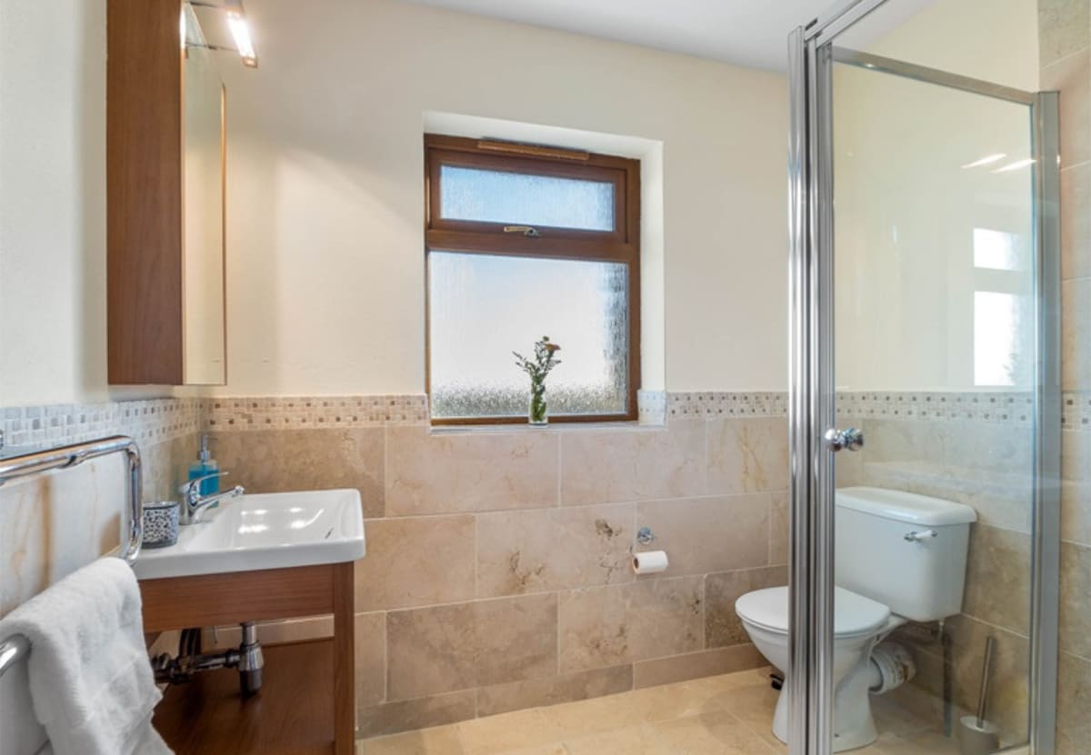 The main bedroom has a double bed sleeping up to 2 guests and a double wardrobe. Ensuite room with shower, toilet, sink, and heated towel rail.