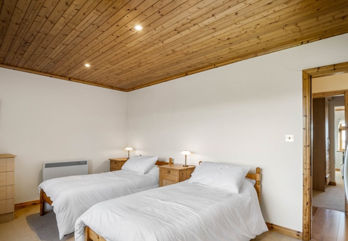 The front bedroom has 2 single beds sleeping up to 2 guests and a free-standing wardrobe.