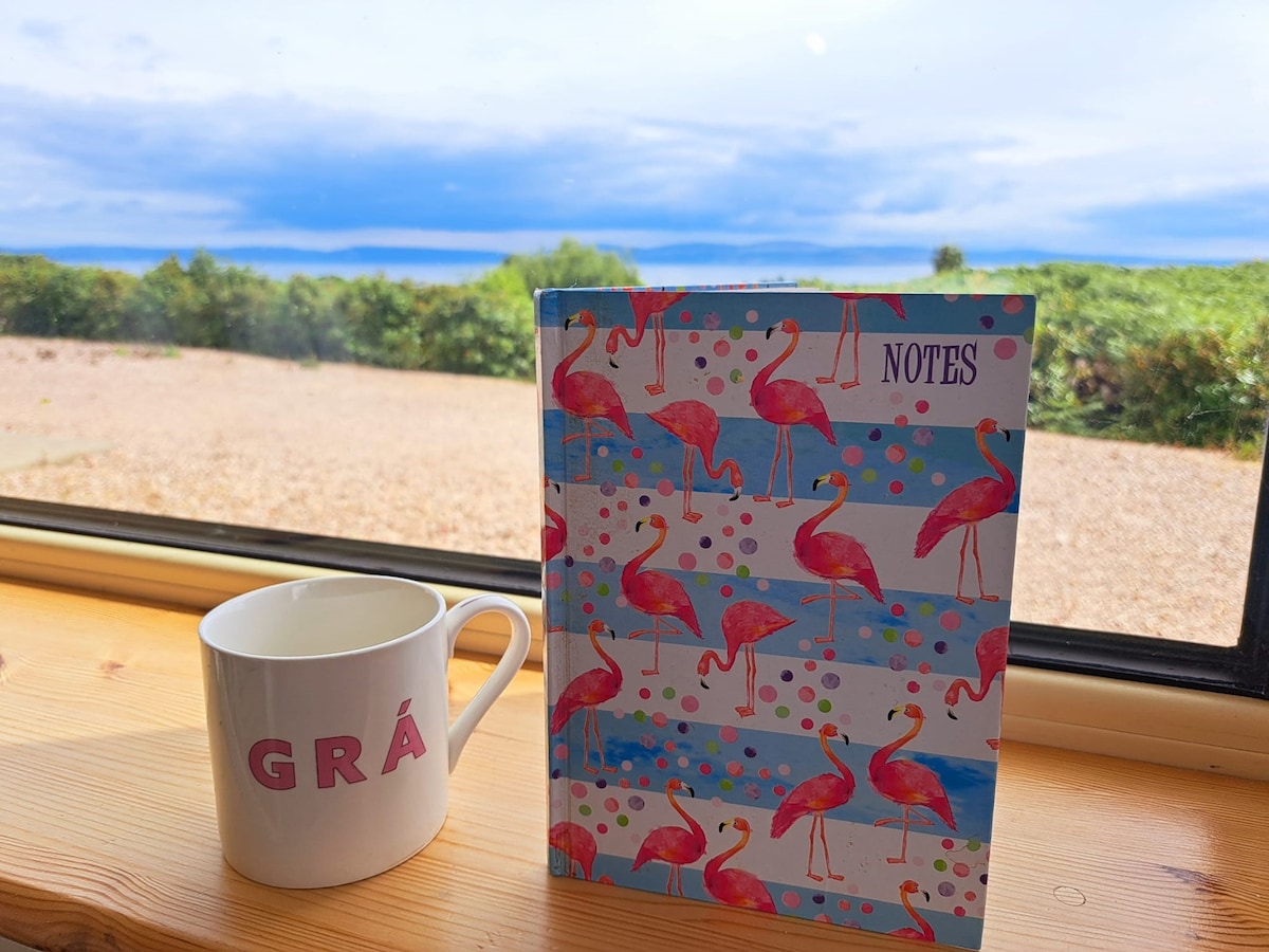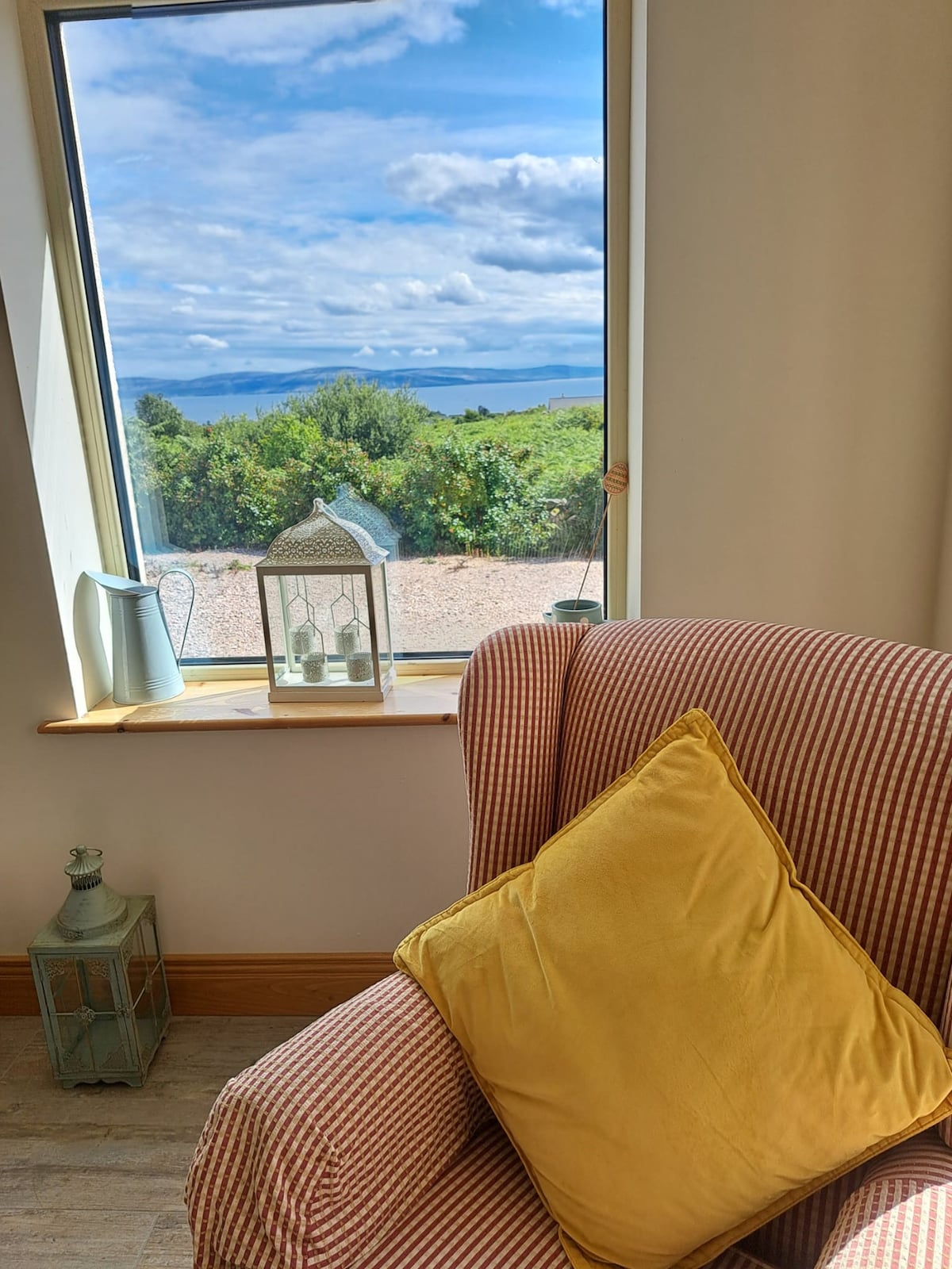 The sitting room has a large window overlooking Galway Bay, a Tv with Saorview channels, comfy couch with a footstool.