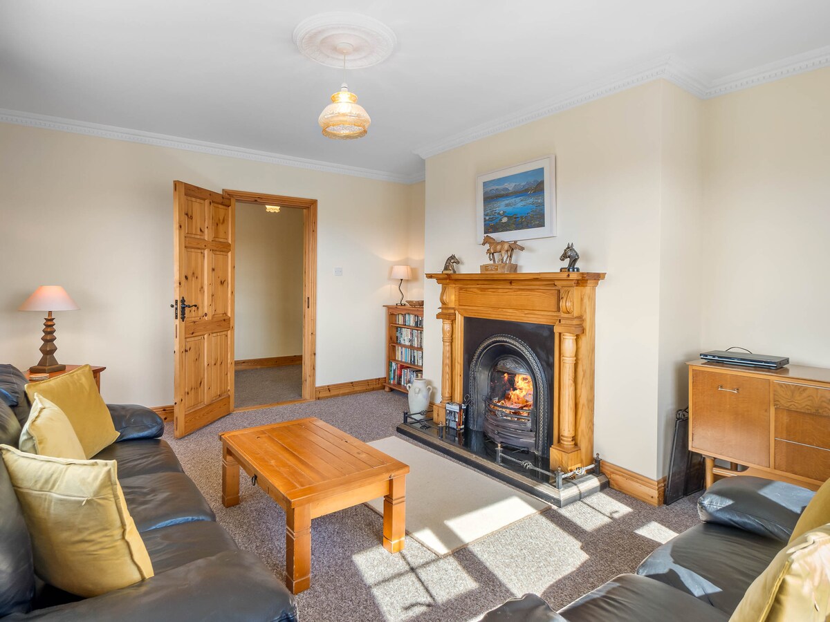 Comfy sitting room with open fireplace, 2 leather sofas.