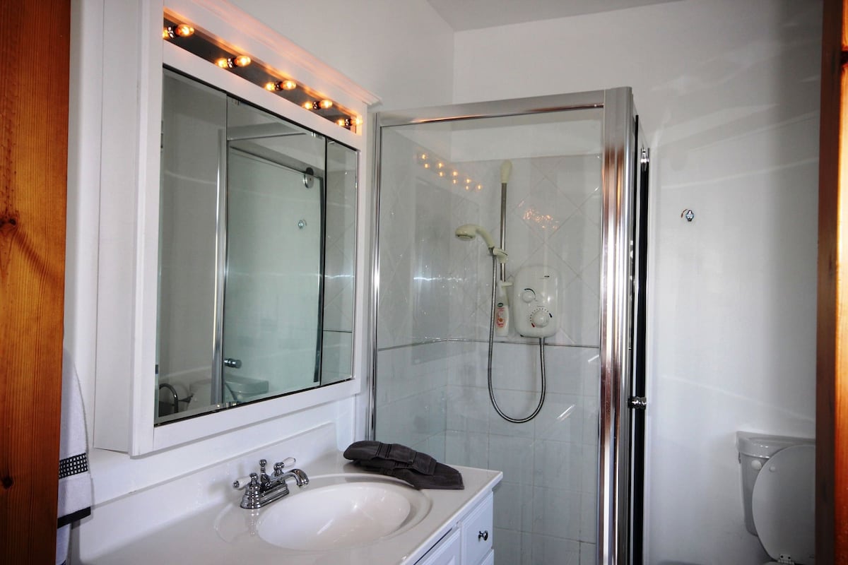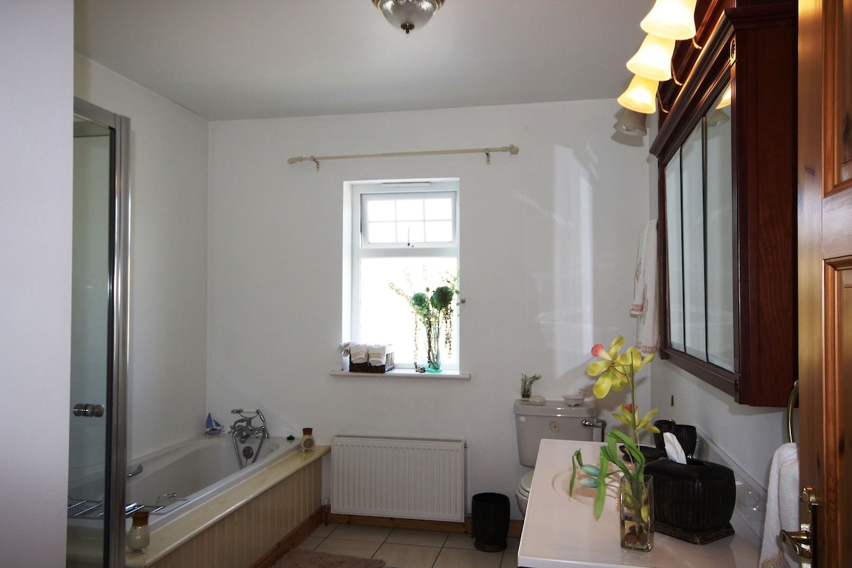 Family bathroom containing bath with shower overhead, sink and Wc.