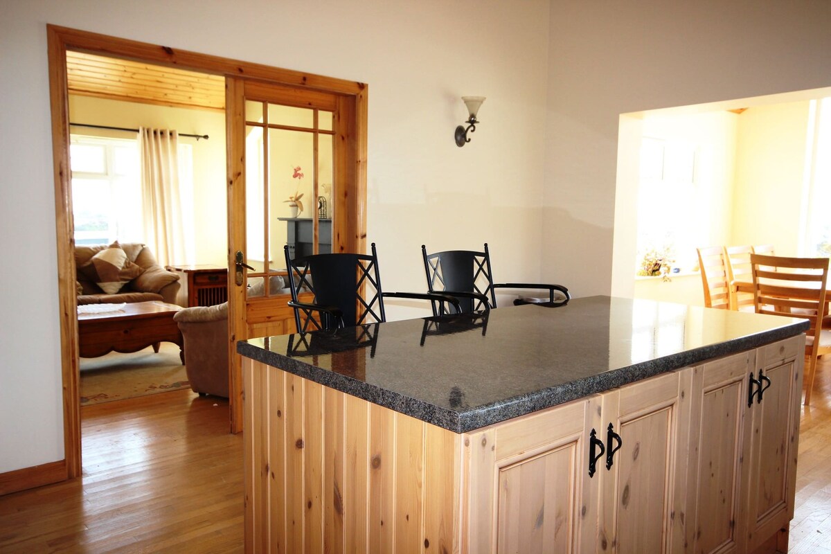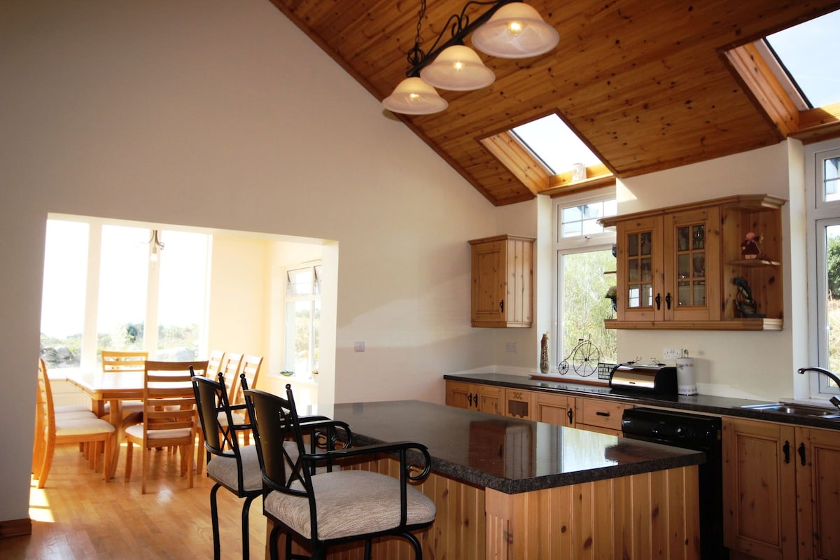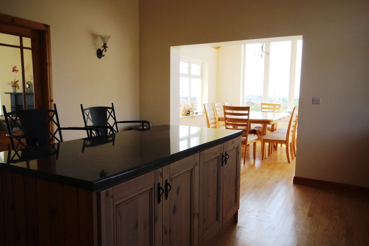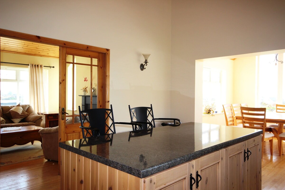 Double doors lead into an impressive open plan kitchen and dining area with high vaulted ceilings, and a fully fitted kitchen with an island/breakfast bar, the conservatory area is used as a dining room oozing natural sunlight with views over Galway Bay. From the dining area is a door leading to the patio area.