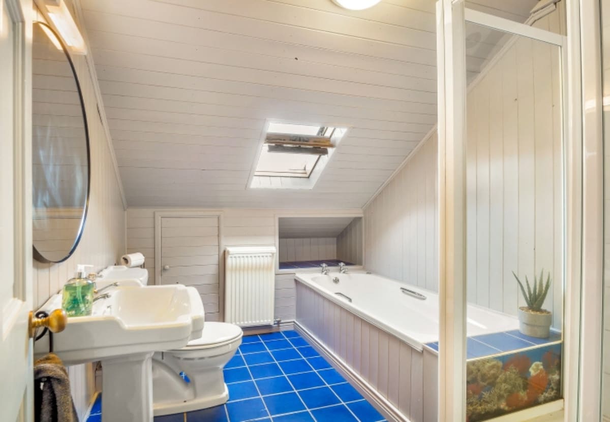 There is one main bathroom, one en-suite with a bath, and a small toilet downstairs.