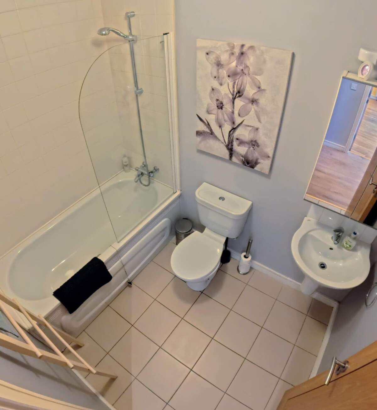 Fully equipped kitchen with oven, dishwasher, and washing machine. The large double bedroom has wooden flooring and a fitted wardrobe. There is a bathroom with bath and overhead shower unit.