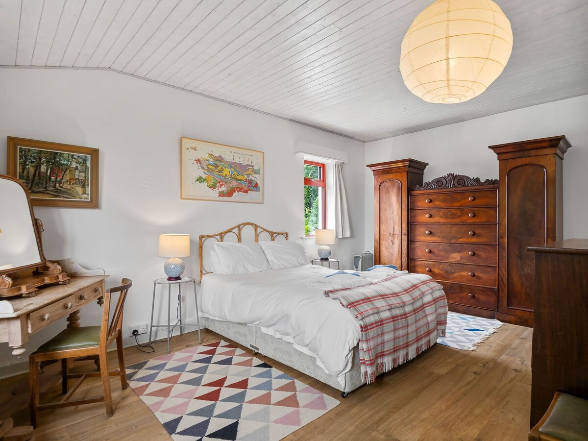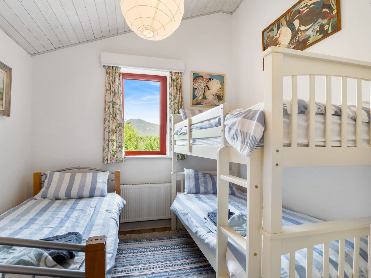 Double/twin – Containing a super king bed, which can be split to make two full-size singles, a chest of drawers and a hanging rail. This room has three windows with views of the sea, Cashel Mountain and the setting sun.