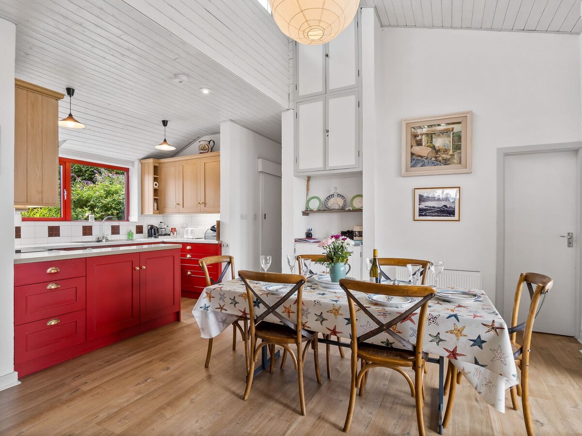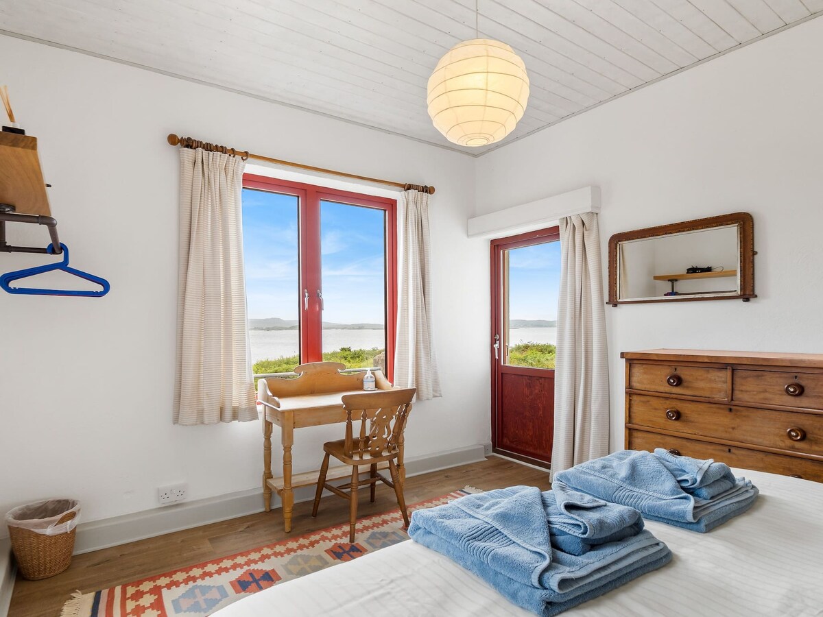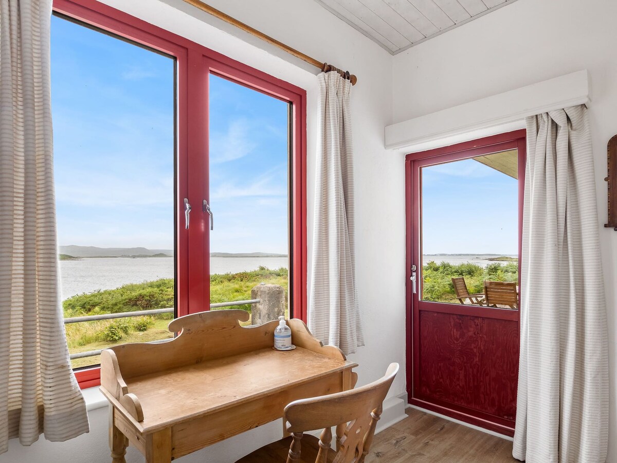 Kitchen/dining area with seating for 8 and views across the bay. High ceilings and large French doors create a sense of light and space. An open fire and comfortable chairs mean you can relax in a cosy, friendly space. Access to the terrace, through the French windows, leads you to the spectacular shoreline.