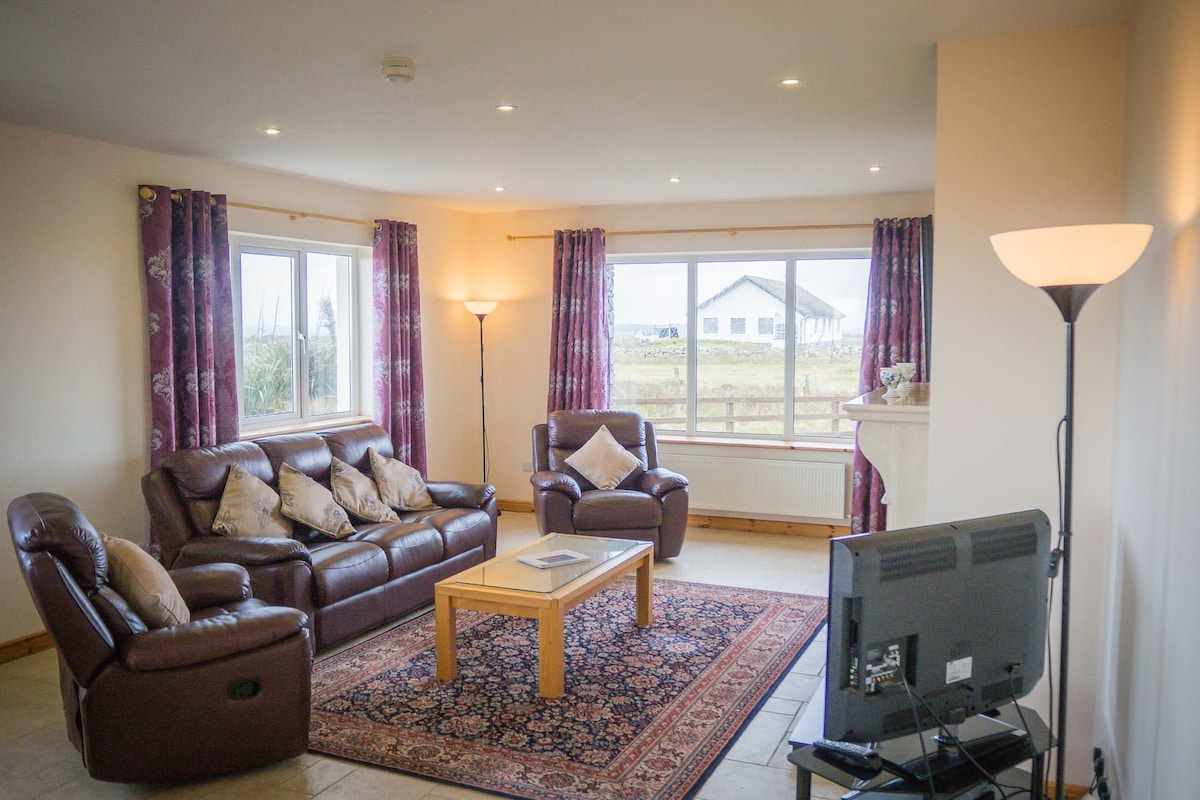 The house has a spacious kitchen/ living area which enjoys superb views of the Atlantic Ocean, Omey Island, High lsland and in the distance the Twelve Bens. This room enjoys warm sunlight from early morning until sunset and is equipped with all modern conveniences (including dishwasher, microwave, wide-screen Tv and Dvd player, radio/CD player etc.)