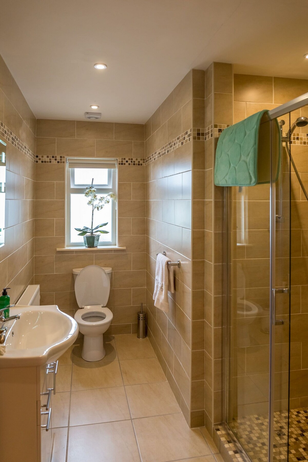 Family bathroom with bath, shower overhead, sink unit and wc.