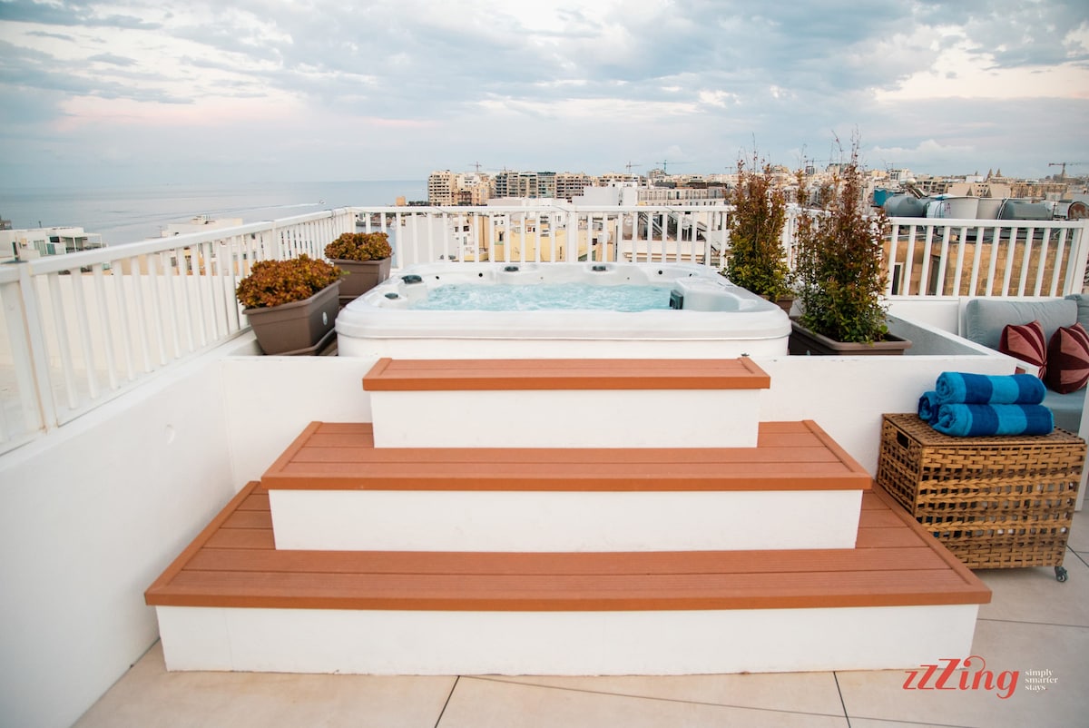 Very well located, within a few minutes walk to Spinola Bay, but set back in a private area so quiet and peaceful. The pool is lovely and the rooftop area with hot tub felt very luxurious too. We were disappointed that we couldn’t check in until 1.5hrs after the agreed check in time, and the room didn’t appear well cleaned when we did get in… when I rolled the sofa bed out it was visibly dirty and I had to remove somebody’s dried up used contact lenses, however on day 2 after the cleaners had been the place was spotless Overall it is a very gorgeous spot and extremely well located, but a couple of small issues that may have just been bad luck and poor housekeeping at the time