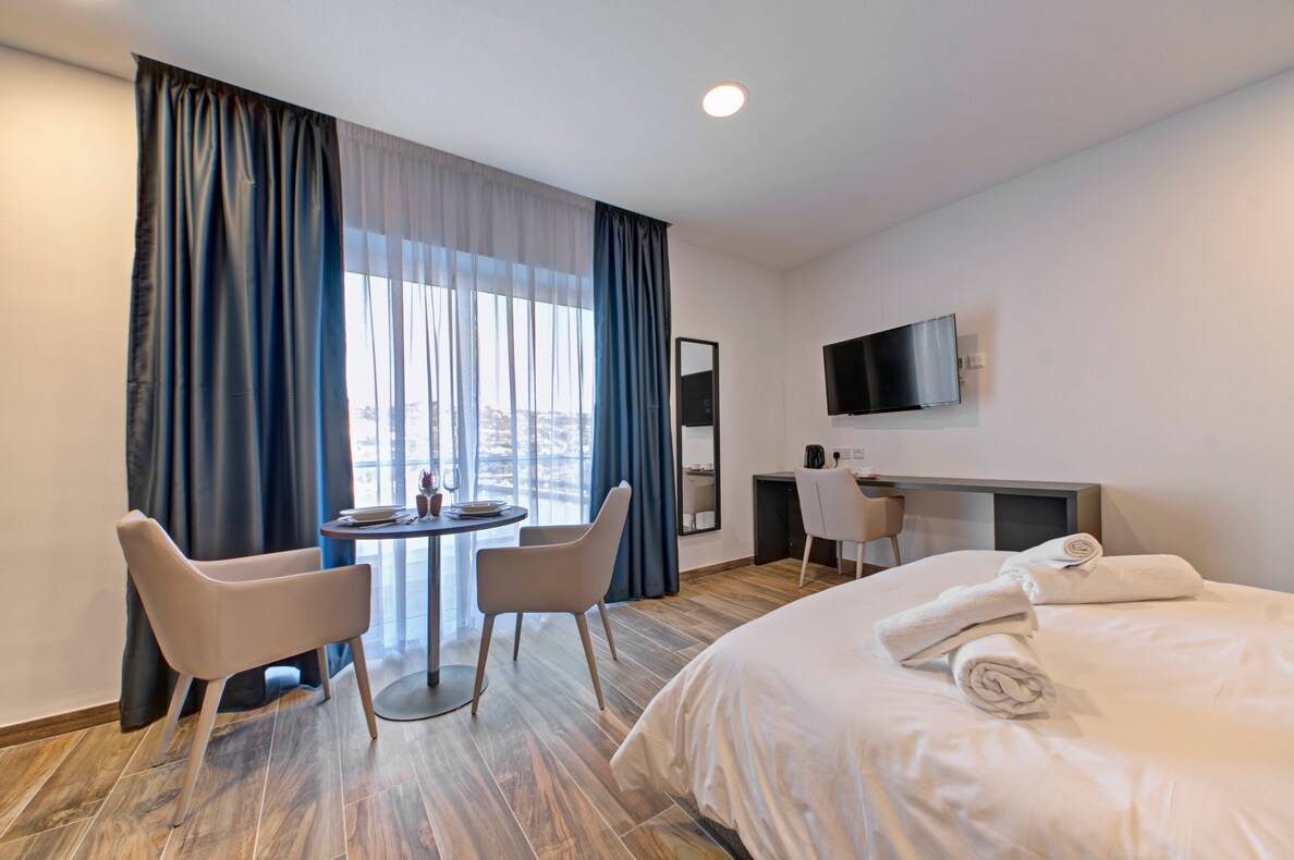 The Deluxe Studio with Balcony is designed to elevate your Malta experience with uninterrupted views of the sparkling Mediterranean Sea. This bright and modern retreat features a cozy double bed, a sleek bathroom, a dedicated workspace, and a dining table for two — perfect for business travelers or couples seeking a romantic escape. Inside, you’ll find a smart TV for logging into your favorite streaming services, ensuring entertainment and relaxation after a day out. Step onto your private balcony to enjoy the refreshing sea breeze and admire the unbeatable location right in the heart of St. Paul’s Bay.Property Highlights: