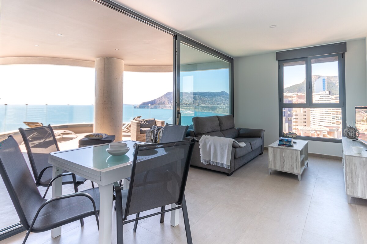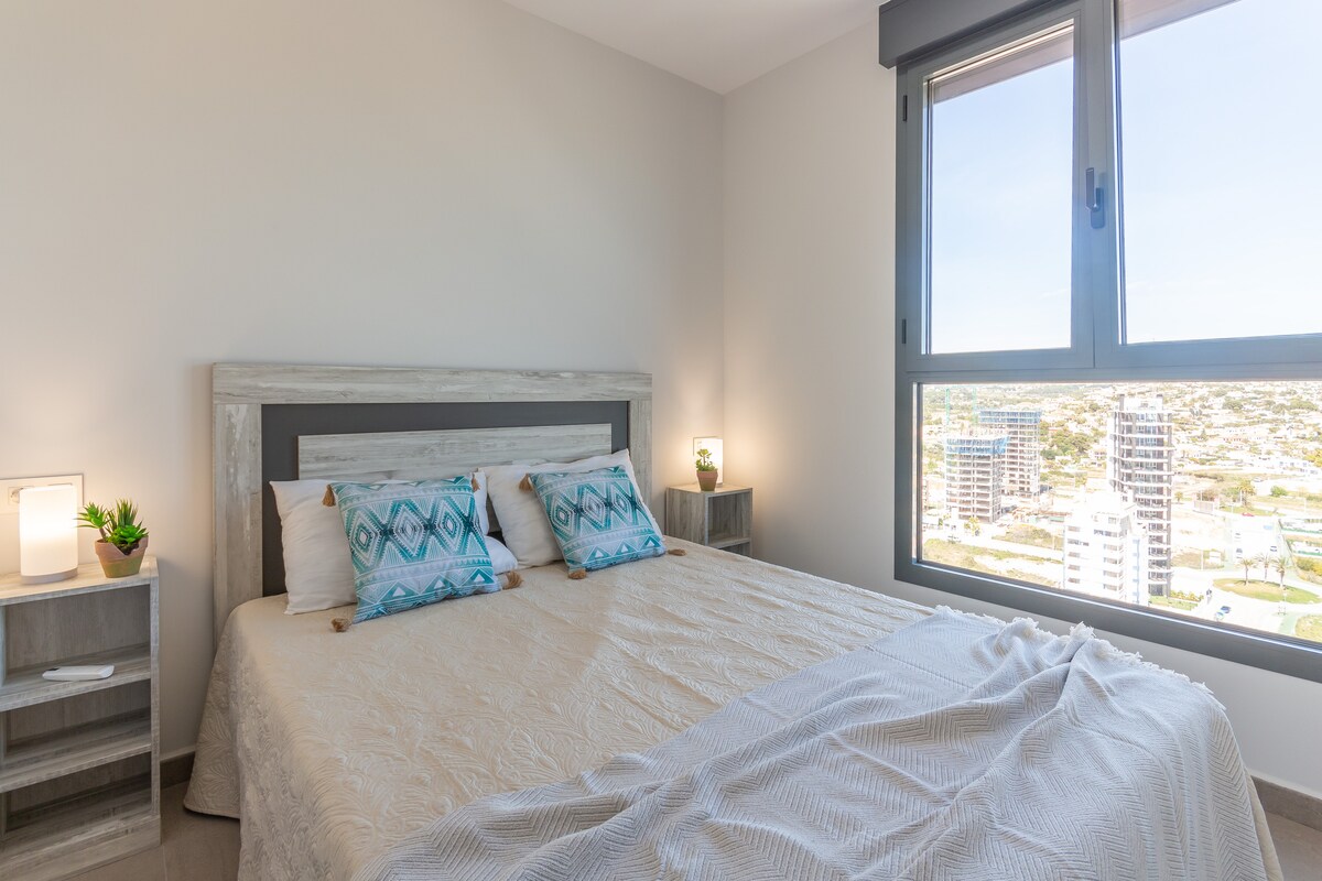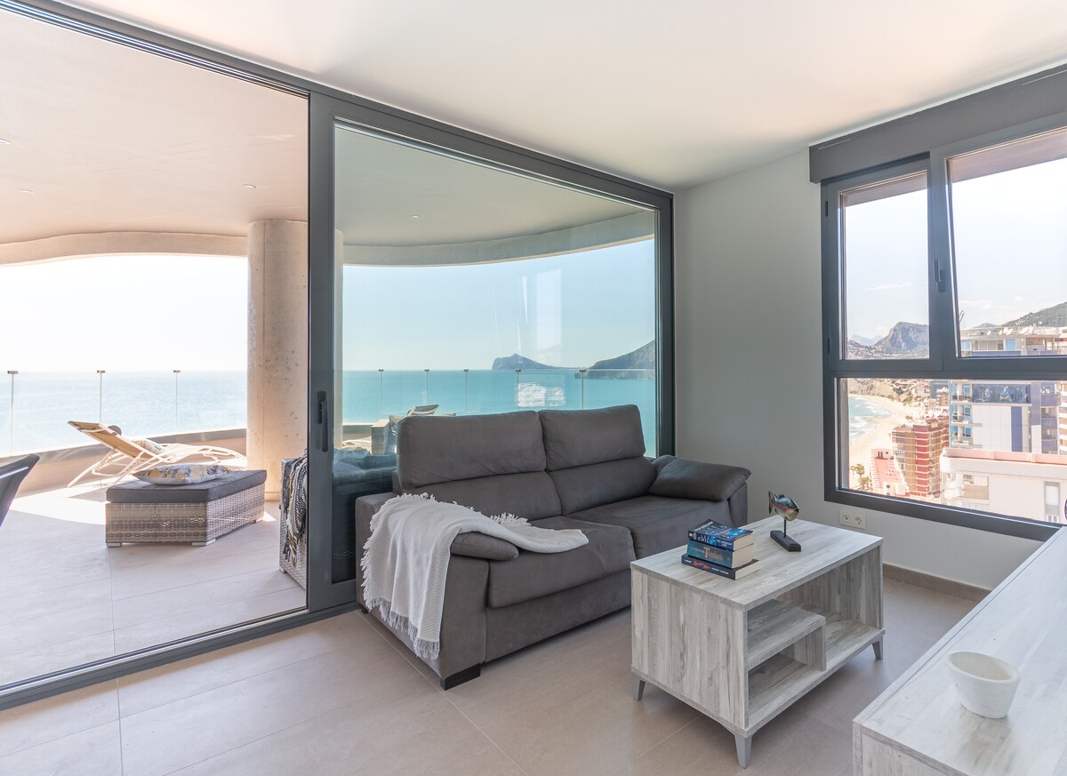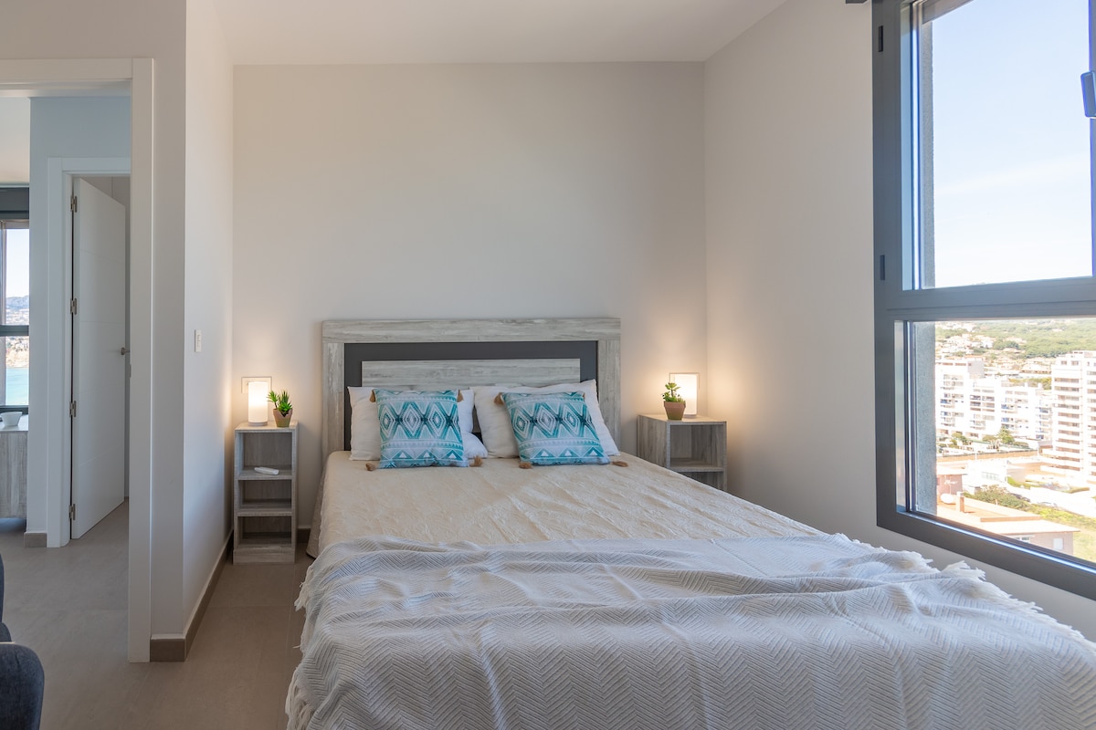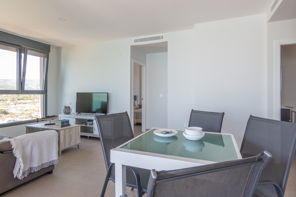 Floor to ceiling windows, front row seats over the blue waters of Arenal Beach, and within strolling distance to the must-see spots in Calpe – these are just a handful of reasons to fall in love with the luxury of Infinium Apartment.While traditional Spanish properties certainly have their charm, sometimes the bliss of a bright new building lends itself well to stress free stays. This two-bed two-bath top of the line apartment has all those added extras – the cool breeze of air-conditioning, WIFI, private parking, modern kitchen, and more.Perched on the sandy shores of Arenal Beach with its Blue Flag status, the apartment sits high enough to enjoy those unrivaled views out across the ocean. From the second you step inside you see the whole apartment has been curated around making the most of those show-stopping sunset vistas. Soaring windows seem to blend open air living, as the well-dressed lounge leads out onto an oversized balcony boasting room enough for shaded al-fresco dining and for flopping down to lounge in the sun. Tasteful color schemes of soft greys and clean whites run throughout – with just the smallest hint of pink to lift the interior design into modernity. The cozy lounge space inside provides a cool and chic relief from the warm weather, making it an idyllic spot for stretching out and watching a movie on the flat screen. There’s an open plan feel to the shared living spaces that capture a lofty penthouse vibe.A well-equipped kitchen comes with all the mod-cons, sparkling white and brand new and both bathrooms are light and airy with steamy showers and plenty of space. The apartment offers two bedrooms, one double and one twin – both with generous windows, sky-high views, and a modern fuss free feel.While self-contained living is certainly on the cards, especially for those content with strolling from beach to bed, there are fabulous fringe benefits to complex style stays. Down in the apartment grounds, little ones can run wild at the children’s playpark, tennis mornings are made to be enjoyed on the court, and winding pathways lead to the large swimming pool complete with loungers for lazy days.If you want to widen your world, then Calpe is one of the glittering stars on the Mediterranean coastline offering a wealth of wonderful beaches, wild nature reserves, Roman ruins, quaint fishing charm, and chic eateries and shops.Costa Blanca and Costa CarpeDiem are waiting for you!Interior of the apartmentair conditioned living/dining room with television