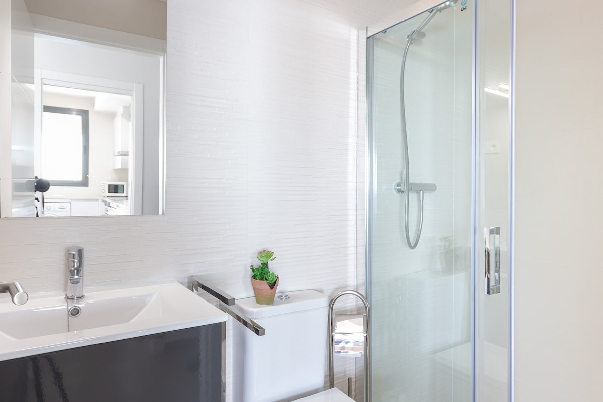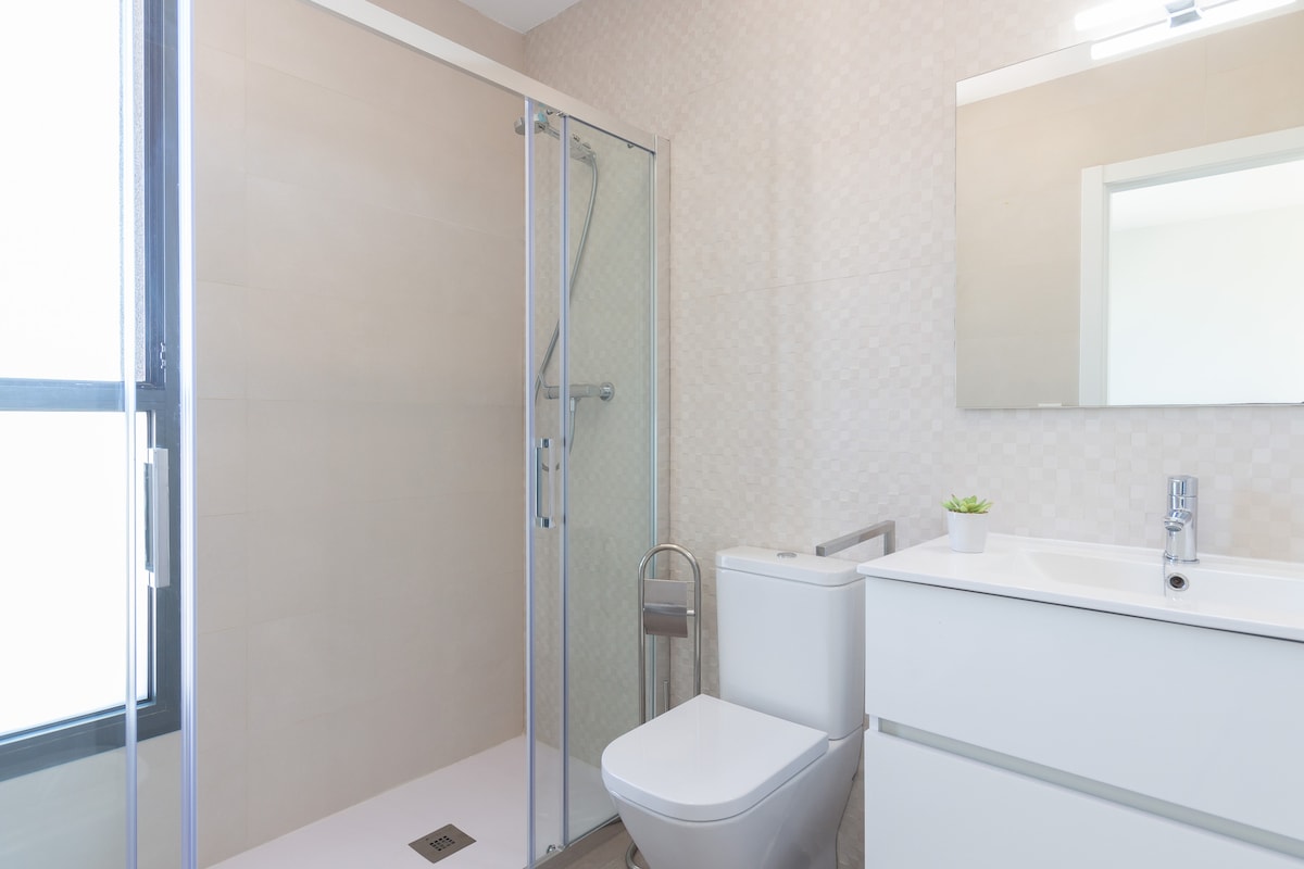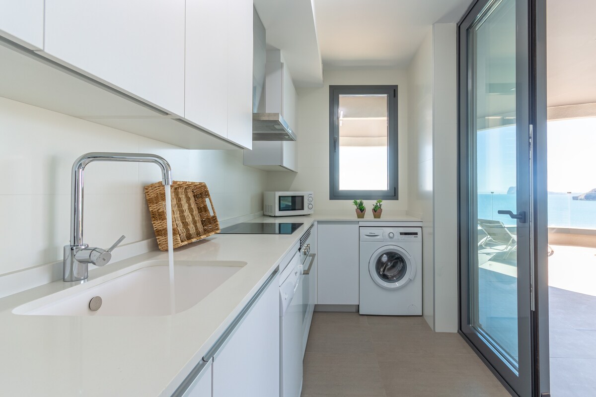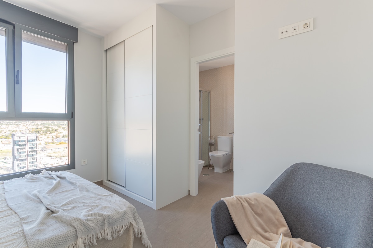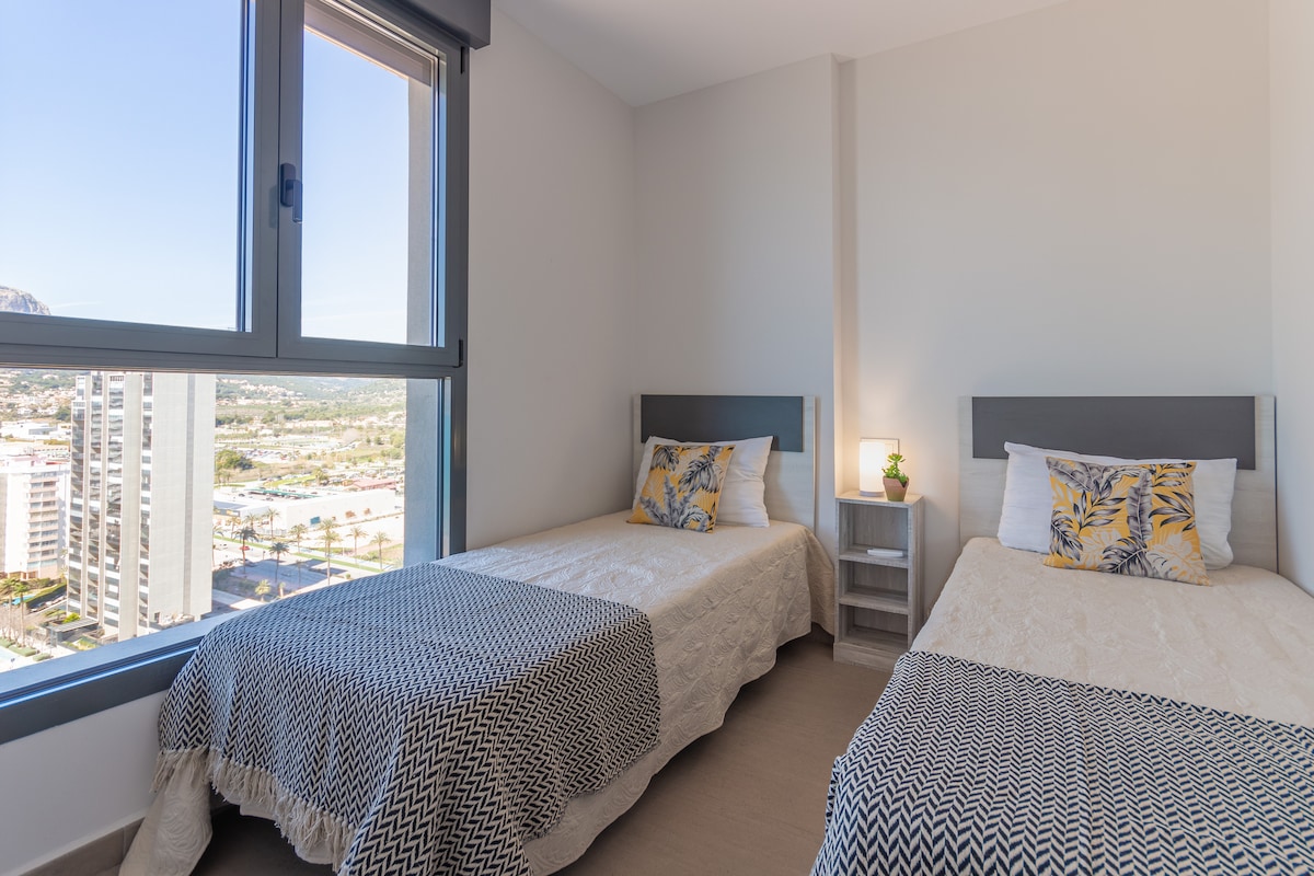Floor to ceiling windows, front row seats over the blue waters of Arenal Beach, and within strolling distance to the must-see spots in Calpe – these are just a handful of reasons to fall in love with the luxury of Infinium Apartment.While traditional Spanish properties certainly have their charm, sometimes the bliss of a bright new building lends itself well to stress free stays. This two-bed two-bath top of the line apartment has all those added extras – the cool breeze of air-conditioning, WIFI, private parking, modern kitchen, and more.Perched on the sandy shores of Arenal Beach with its Blue Flag status, the apartment sits high enough to enjoy those unrivaled views out across the ocean. From the second you step inside you see the whole apartment has been curated around making the most of those show-stopping sunset vistas. Soaring windows seem to blend open air living, as the well-dressed lounge leads out onto an oversized balcony boasting room enough for shaded al-fresco dining and for flopping down to lounge in the sun. Tasteful color schemes of soft greys and clean whites run throughout – with just the smallest hint of pink to lift the interior design into modernity. The cozy lounge space inside provides a cool and chic relief from the warm weather, making it an idyllic spot for stretching out and watching a movie on the flat screen. There’s an open plan feel to the shared living spaces that capture a lofty penthouse vibe.A well-equipped kitchen comes with all the mod-cons, sparkling white and brand new and both bathrooms are light and airy with steamy showers and plenty of space. The apartment offers two bedrooms, one double and one twin – both with generous windows, sky-high views, and a modern fuss free feel.While self-contained living is certainly on the cards, especially for those content with strolling from beach to bed, there are fabulous fringe benefits to complex style stays. Down in the apartment grounds, little ones can run wild at the children’s playpark, tennis mornings are made to be enjoyed on the court, and winding pathways lead to the large swimming pool complete with loungers for lazy days.If you want to widen your world, then Calpe is one of the glittering stars on the Mediterranean coastline offering a wealth of wonderful beaches, wild nature reserves, Roman ruins, quaint fishing charm, and chic eateries and shops.Costa Blanca and Costa CarpeDiem are waiting for you!Interior of the apartmentair conditioned living/dining room with television