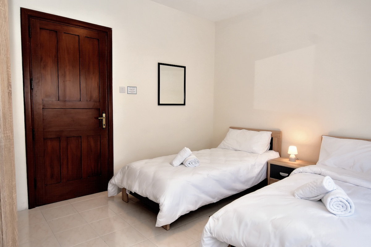 In the first bedroom you will find 2 spacious single beds, a wardrobe, a mirror and an en-suite bathroom with shower, basin and the toilet.