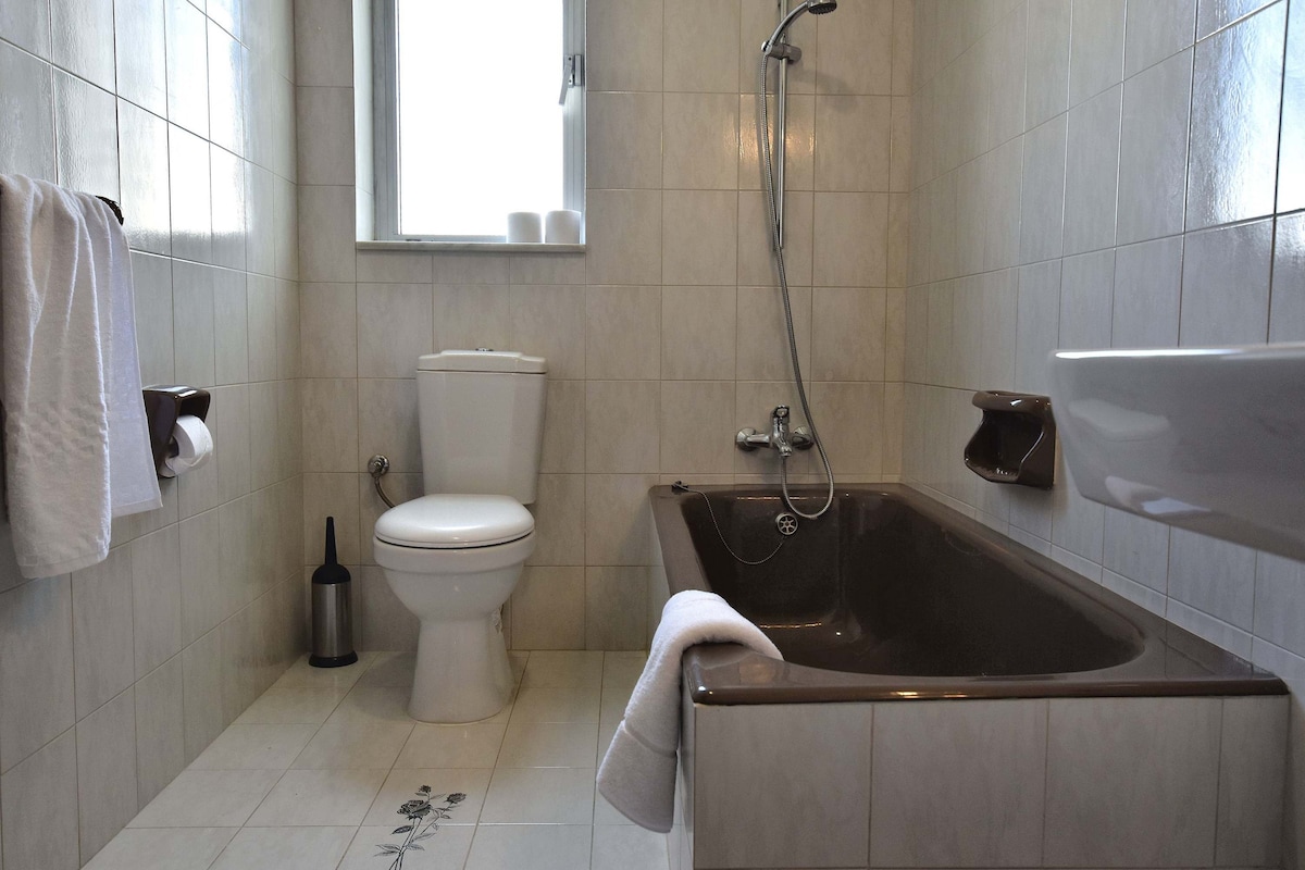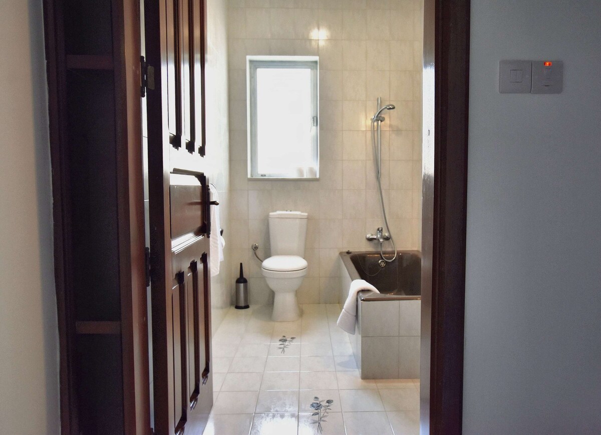 Just next to the second bedroom, you will see the door leading to the main bathroom, equipped with spacious bathtub, a toilet, and a basin with a mirror.
