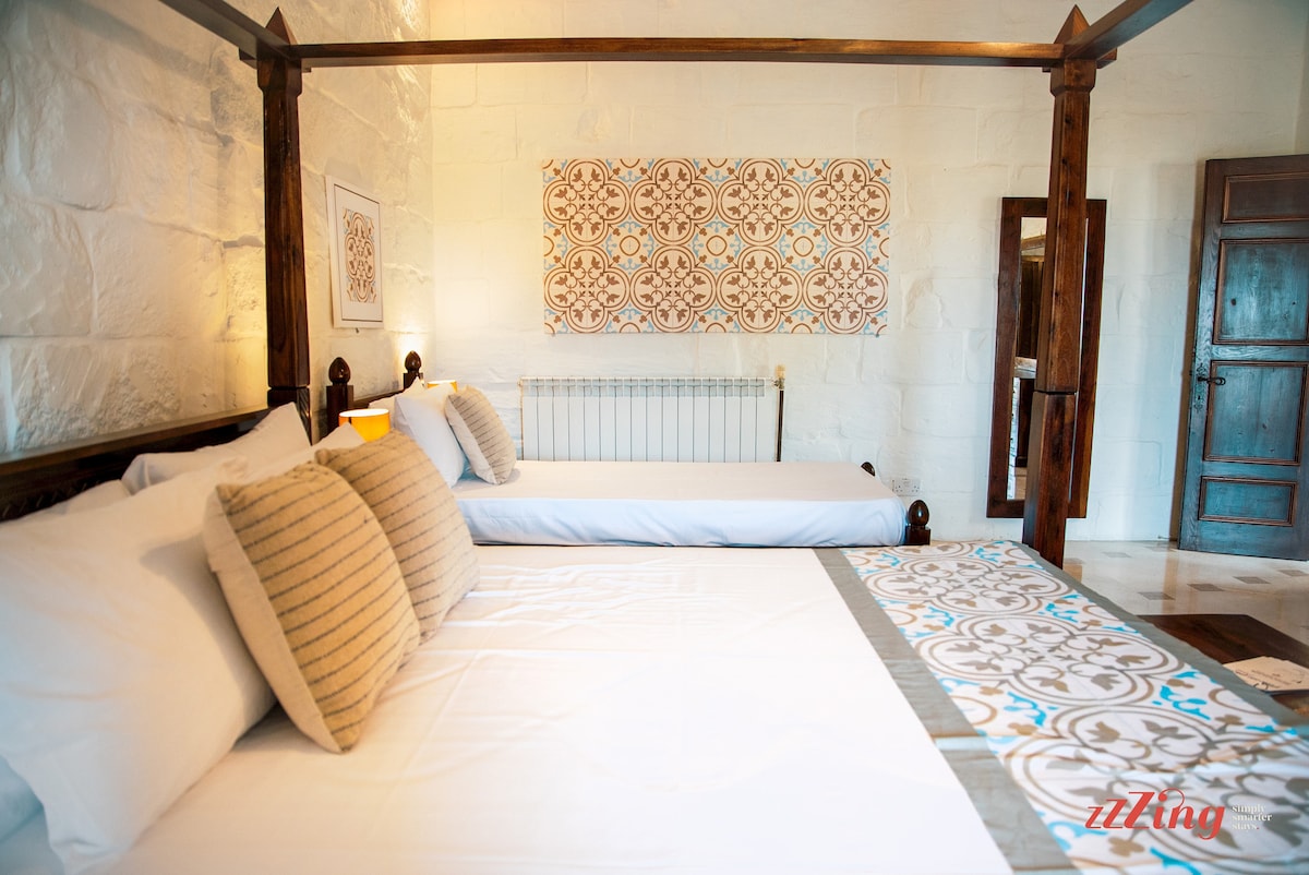 With an abundance of character, warmth, and charm, there’s everything you could need for an enchanting retreat in Gozo. Rated as one of the island’s most in-demand holiday homes, this space has hosted some of the world’s most celebrated artists and brands. HR teams love booking this property for team-building events, while wedding planners secure this space for couples looking for an intimate wedding venue. Put simply, this holiday home is as magical as they come.Step inside and you’ll quickly dive into the addictive vibe of this space. The first thing you’ll notice is a courtyard with robust trees, allowing you to feel the power of nature around you. This holiday home sleeps 18 and boasts 6 bedrooms, four of which are ensuite, and two additional bathrooms on both levels. All bedrooms are extremely large, and one of the main bedrooms has a balcony overlooking the grand outdoors, typically selected for a Romeo & Juliet photo moment.