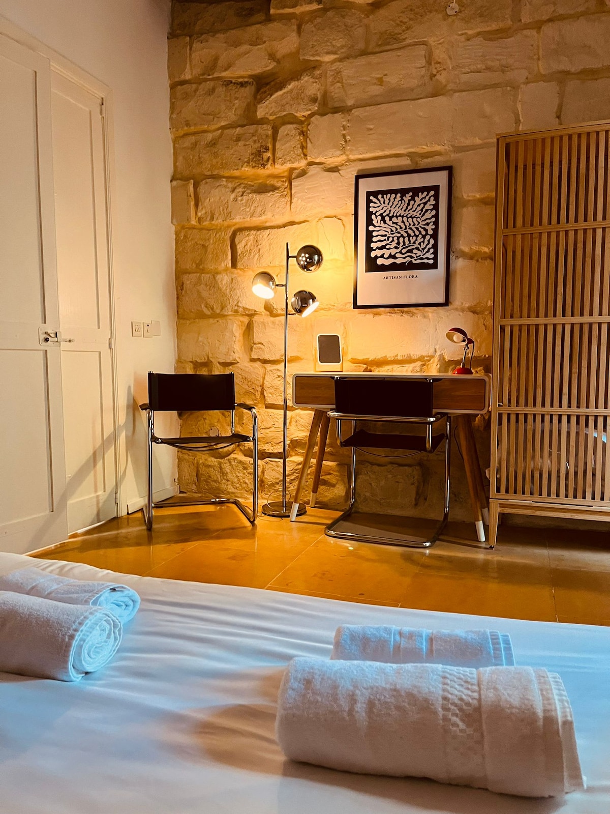 Upon going up the restored original one-hundred-year-old stone spiral staircase, one finds the first two bedrooms, each with its own distinct character and both set on traditional Maltese limestone “cangaturi” flooring, which is also over 100 years old. The master bedroom, with its own ensuite, on the right side of the hall features a very comfortable bespoke bed complete with a memory foam mattress, a vanity, and a large contemporary Italian-style bathroom. Complementing the master bedroom is a private terrace overlooking the garden.