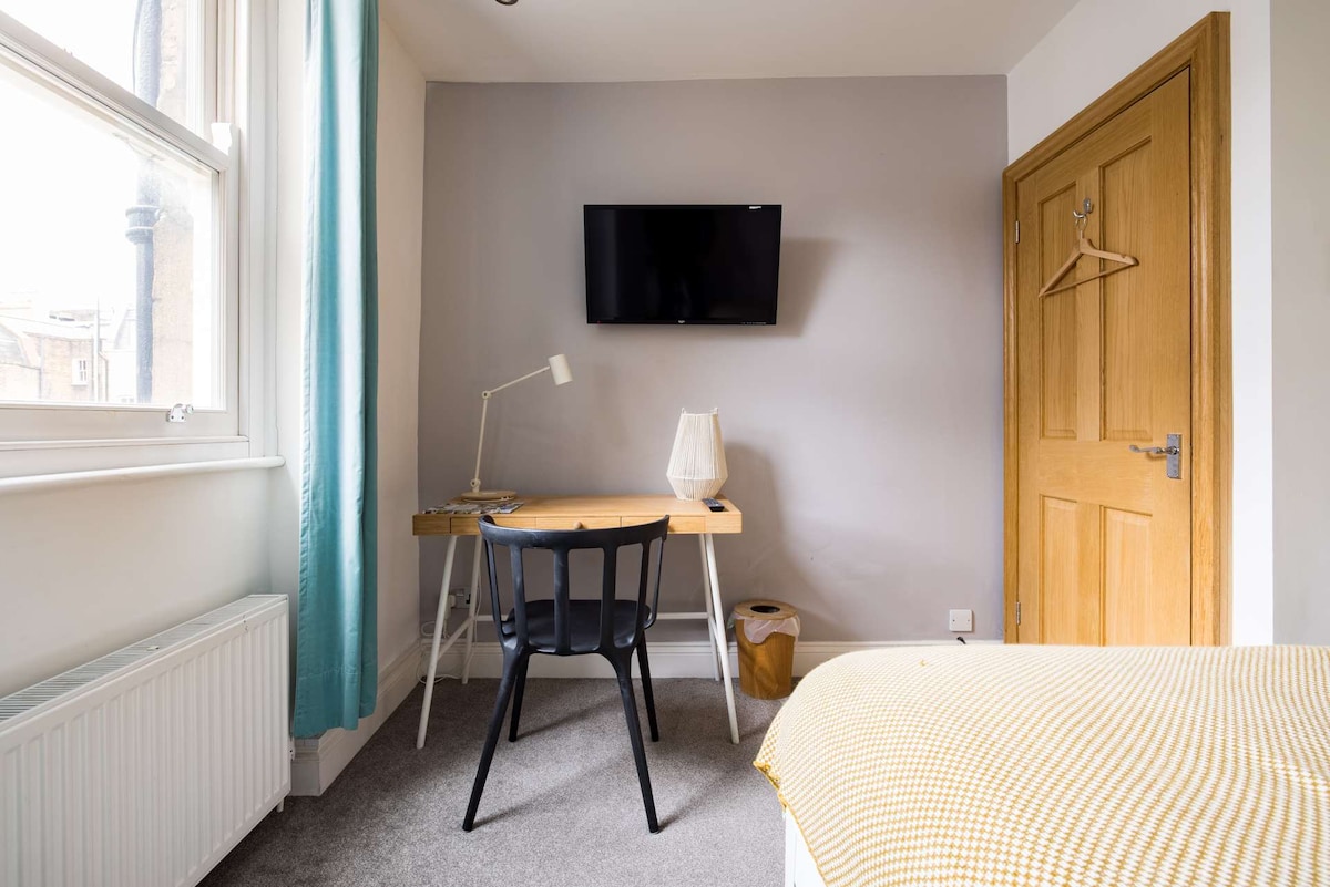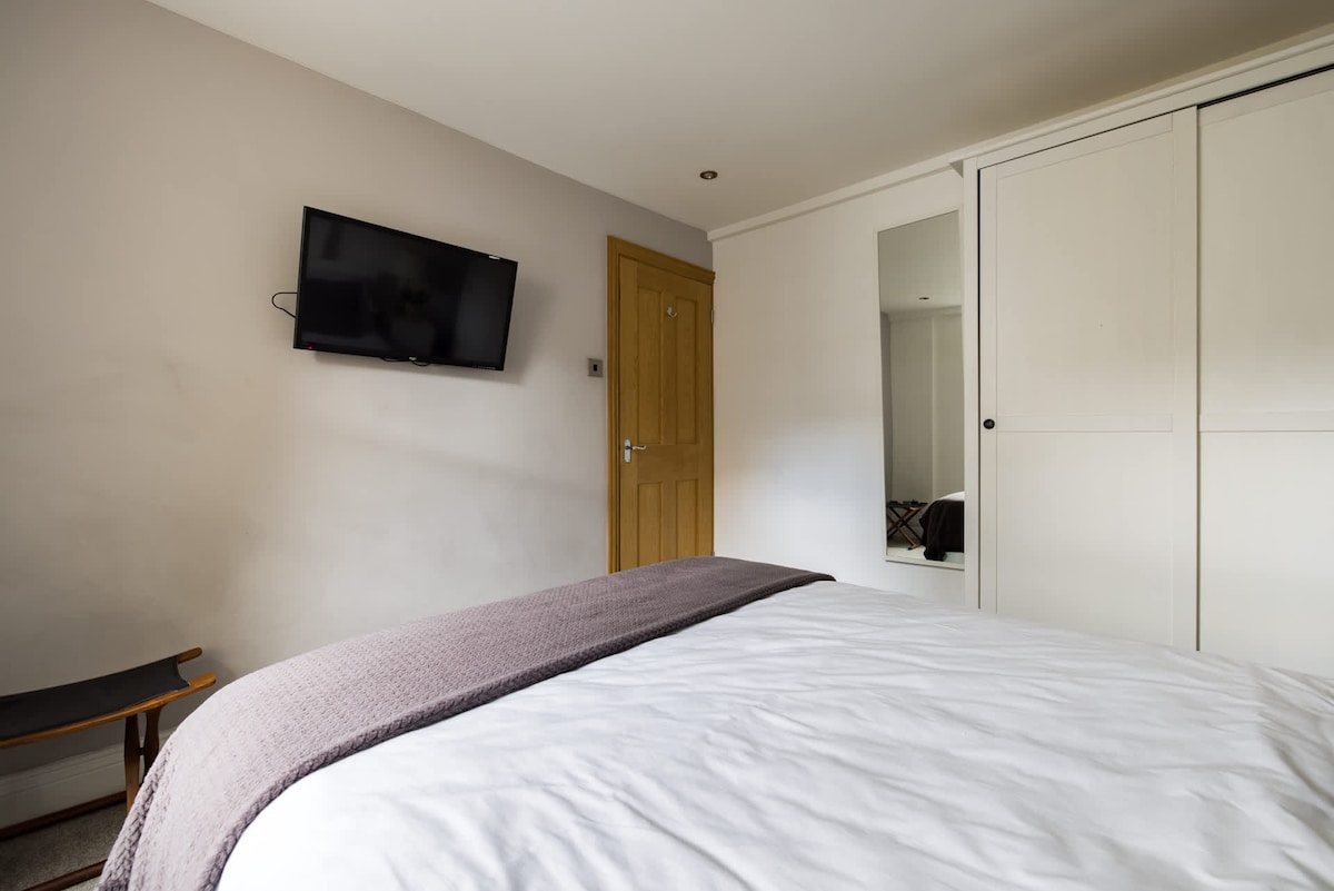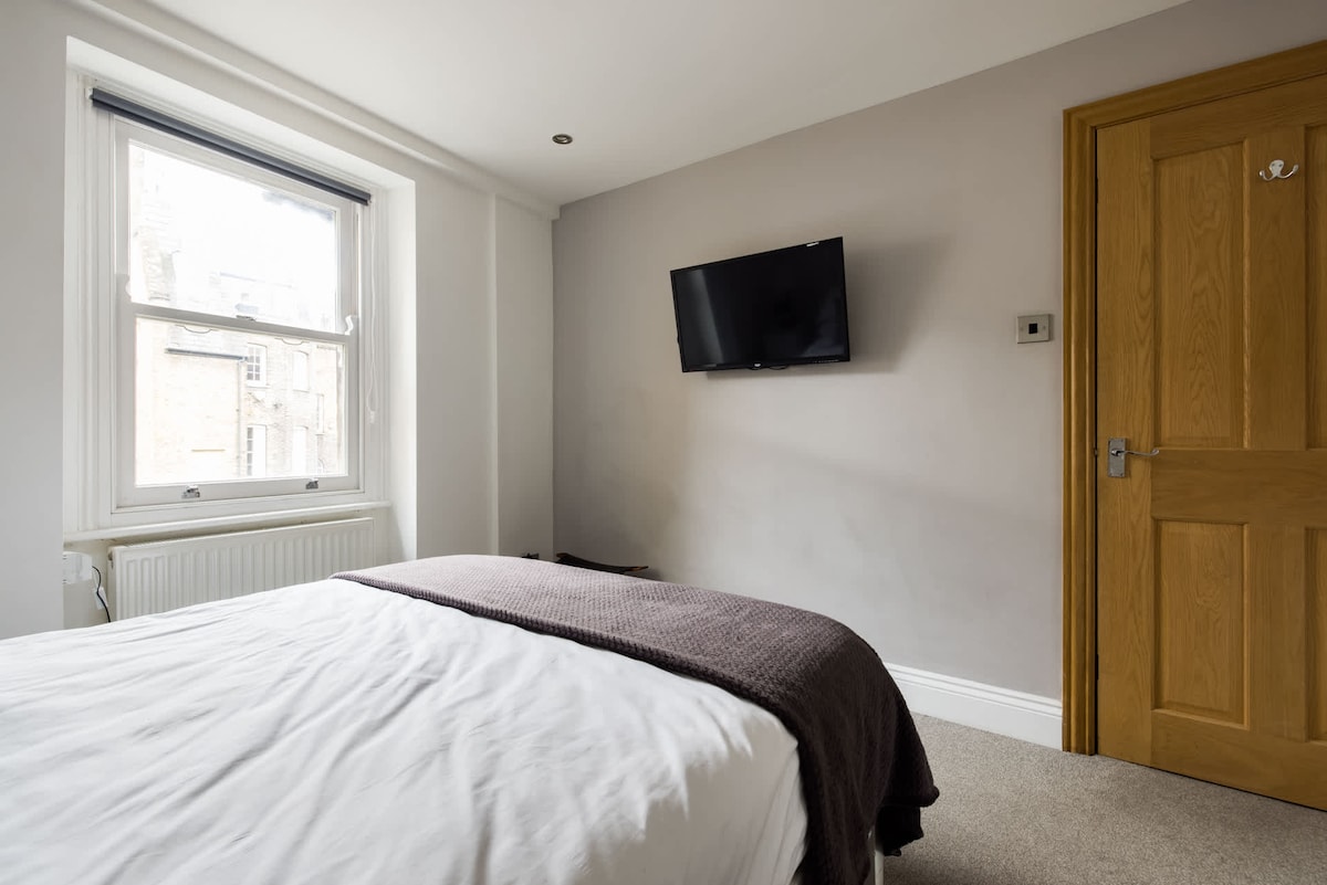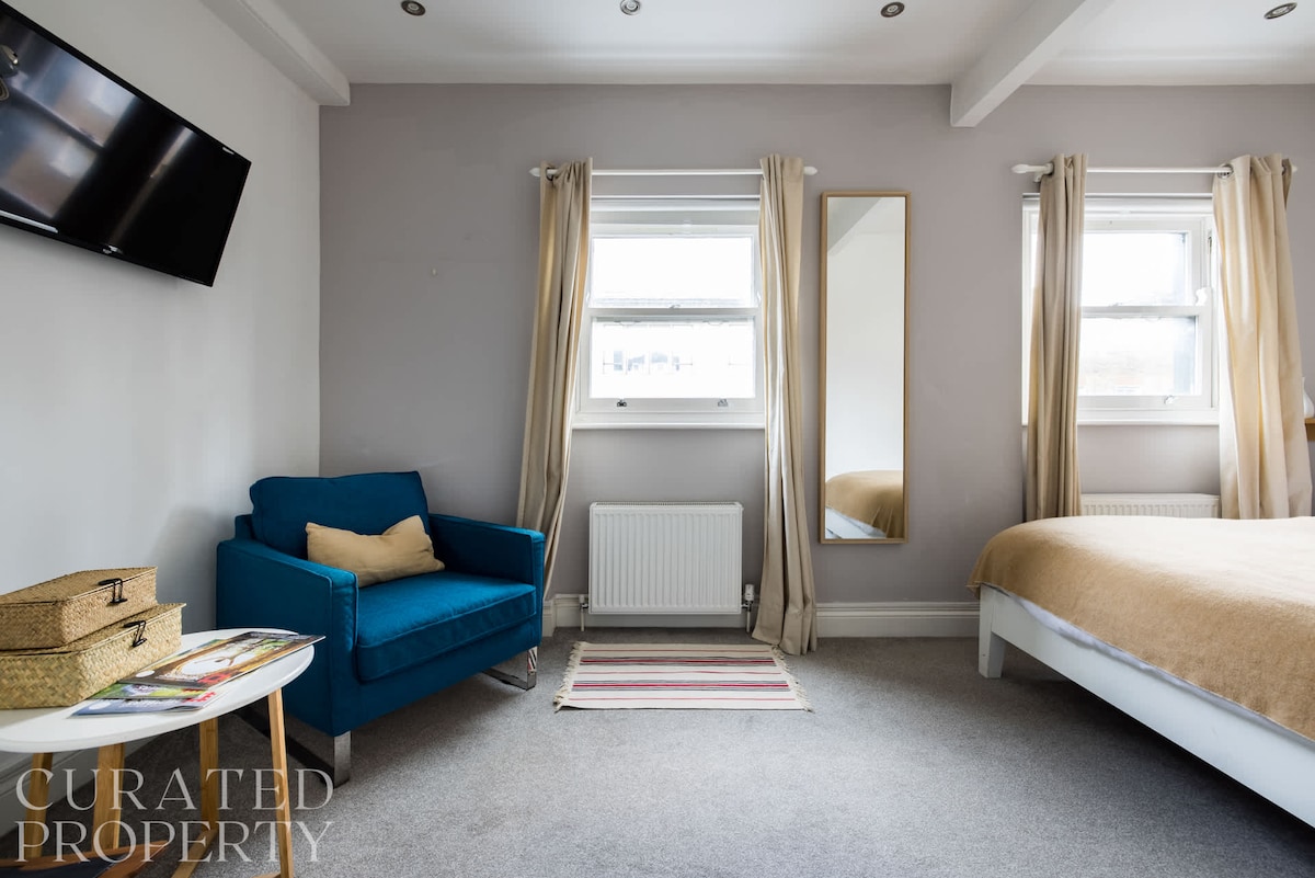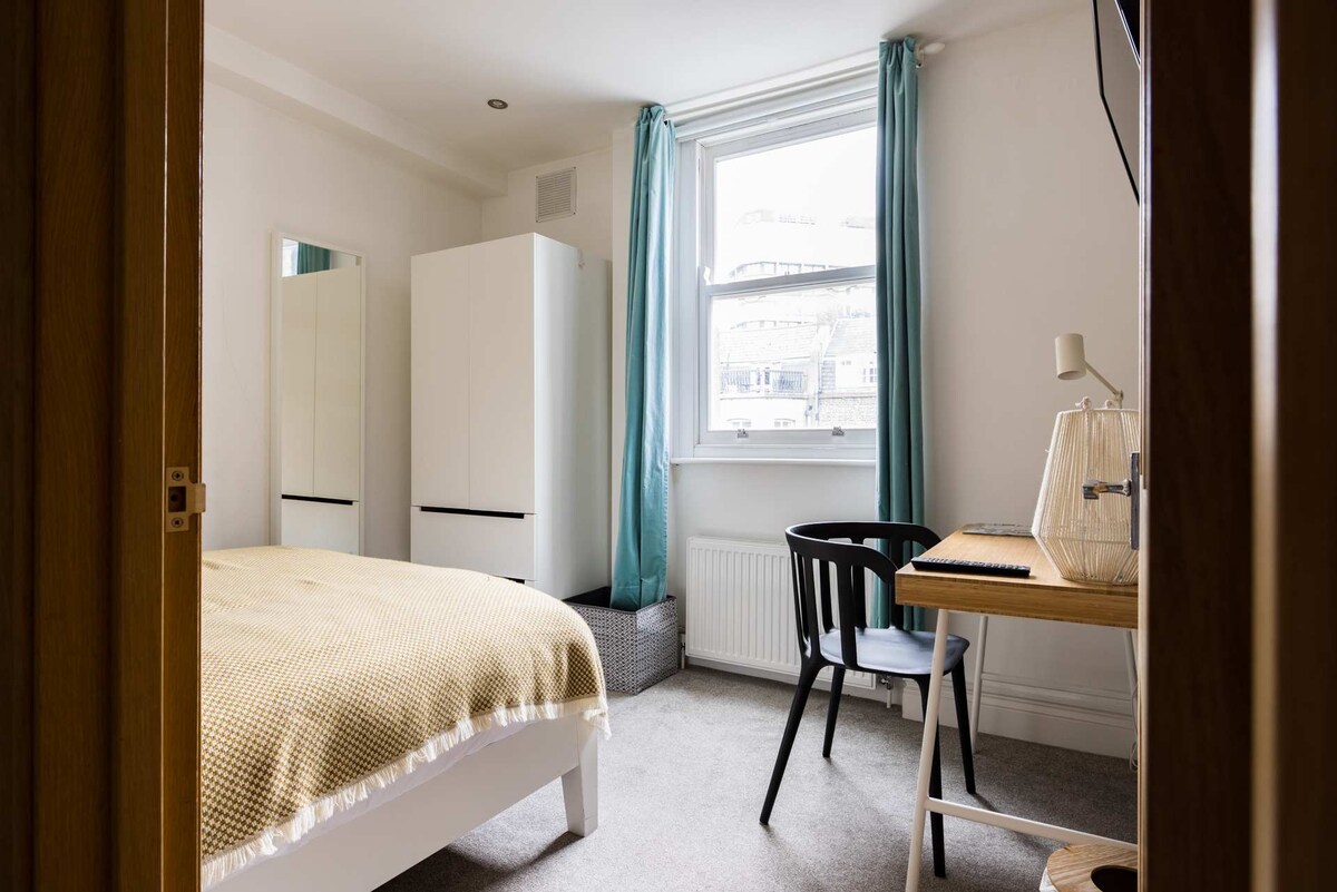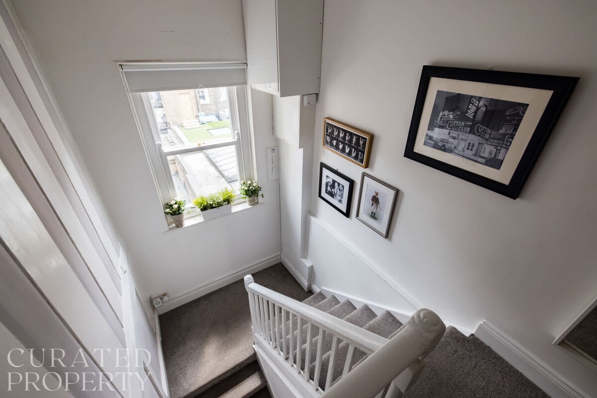 This contemporary duplex occupies the second and third floors of this restored Victorian terraced building with a communal front door entrance. As you walk through the door you will be welcomed by an inviting open-plan living room and kitchen. The living area has a corner sofa, which doubles as a very comfortable bed with a clever coffee table in front that transforms to provide dining table for 8. Plenty of light floods this room and it makes for a useful conference room for business meetings or just family get together's. The corner kitchen has solid granite surfaces with intelligently designed units and comes fully equipped, suitable for cooking large meals. There is a smart TV mounted on the wall.On the same floor there is a double bedroom, that has a large sash window looking south away from the road with a view over the backs of the surrounding houses. The bedroom is equipped with a comfortable double bed and ample storage for clothes. The bedroom also features a flat screen TV.