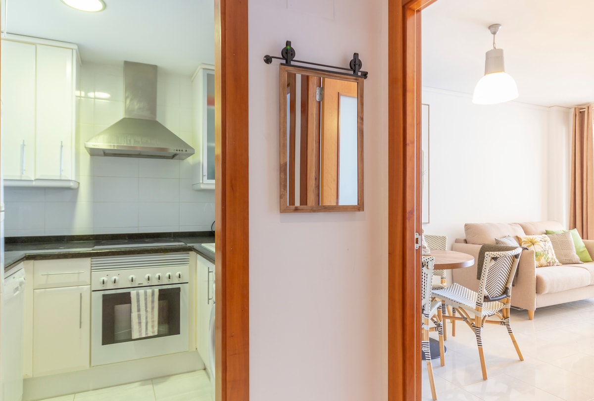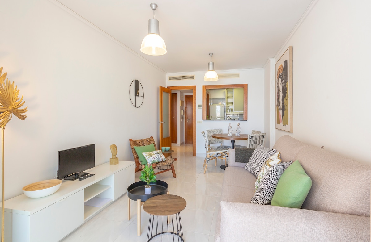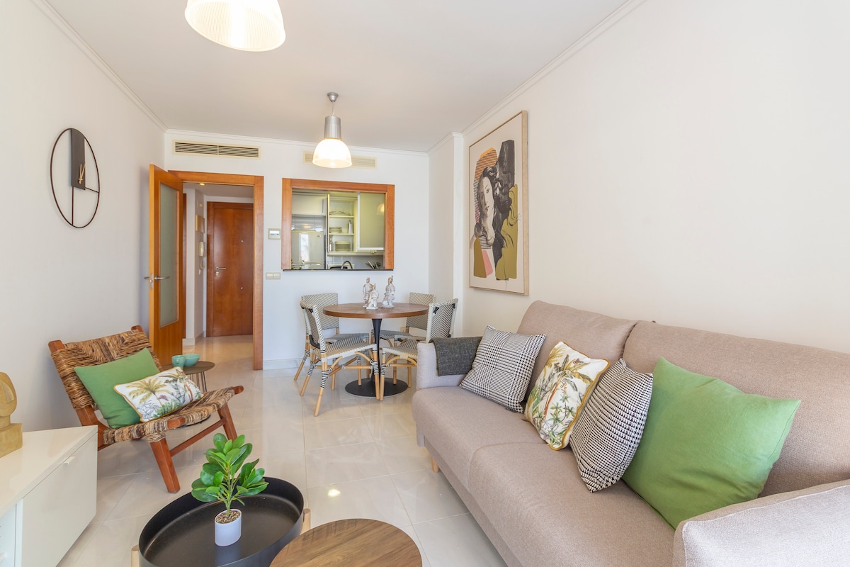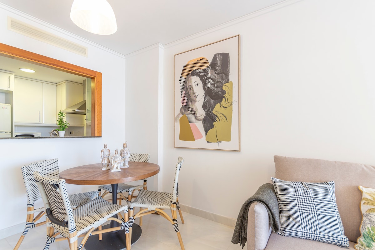 Do you fancy a cool bath just at dawn? Or maybe you are one of those who like a dip before eating or after a nap? In the Mesana apartment you have it very easy. It is located 50 m from La Fossa beach and has a beautiful community swimming pool with lawn. It doesn't matter if you're more of saltwater or freshwater! In the Mesana apartment you have two options to choose from!Recently decorated by professional interior designers, it has 1 double bedroom and 1 bathroom, but it is suitable for three people, since the living/dining room has a sofa-bed. Both the bedroom and the living room are equipped with air conditioning to guarantee maximum comfort.The accommodation is designed to make your vacation easier and has cable TV in the dining room, an American kitchen equipped with all appliances and a complete bathroom with sink, shower and bathtub combination, toilet and hair dryer.Although when you see the beautiful views of the apartment from the terrace, you will hardly want to stay inside! Just enough to sleep, nap and little else. The bay of Calpe, the beach, are in sight and invite you to enjoy it.The lawn garden, the swimming pools for adults and children, the playground, are at your disposal so that you can leave your apartment and enjoy them with your family. There you can swim in the pool, relax on the lawn, but also have a place to eat. And if you want to go further you have many options. And we are not just referring to the beautiful beach of La Fossa. Very close to the holiday apartment you have places to go out, to practice sports or to relax with a cold drink or try some of the gastronomic delights offered by Calpe's bars and restaurants.And best of all, you hardly have to drive! As almost everything you need is a stone's throw away, you can leave your car in the parking space as soon as you arrive and forget about it during your vacation.Costa Blanca and Costa CarpeDiem are waiting for you!Interior of the apartmentair conditioned living/dining room with television and sofabed
