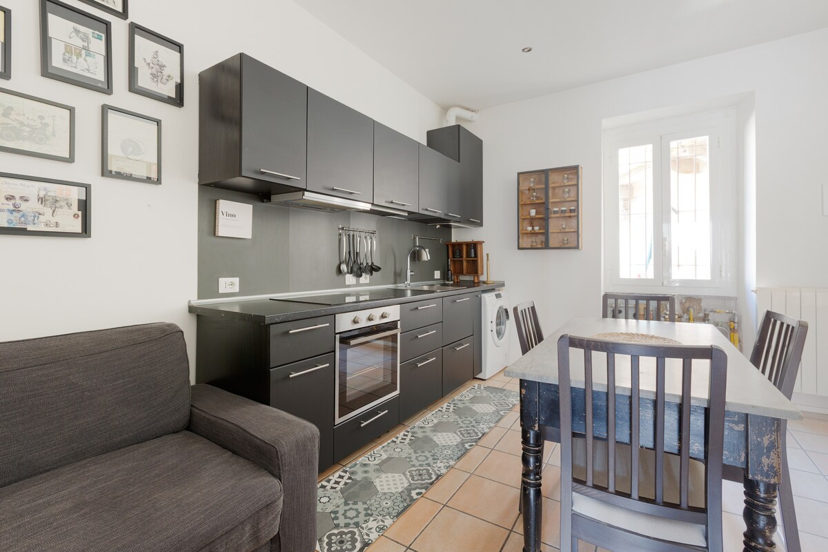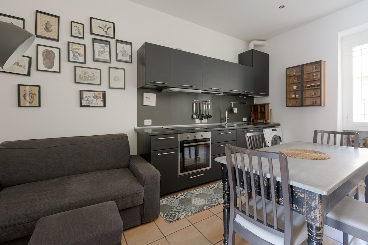 The apartment is organized as follows:- LIVING ROOM with KITCHENETTE (induction hob, fridge, freezer, oven, moka, kettle, wine glasses and other kitchen utensils), dining table, bed sofa and TV;