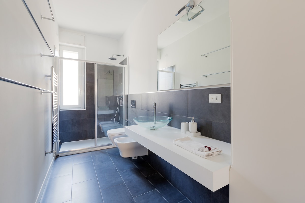 - BATHROOM with shower box (raised), sink, bidet and WC;