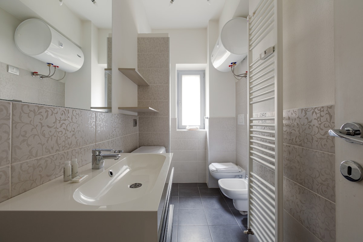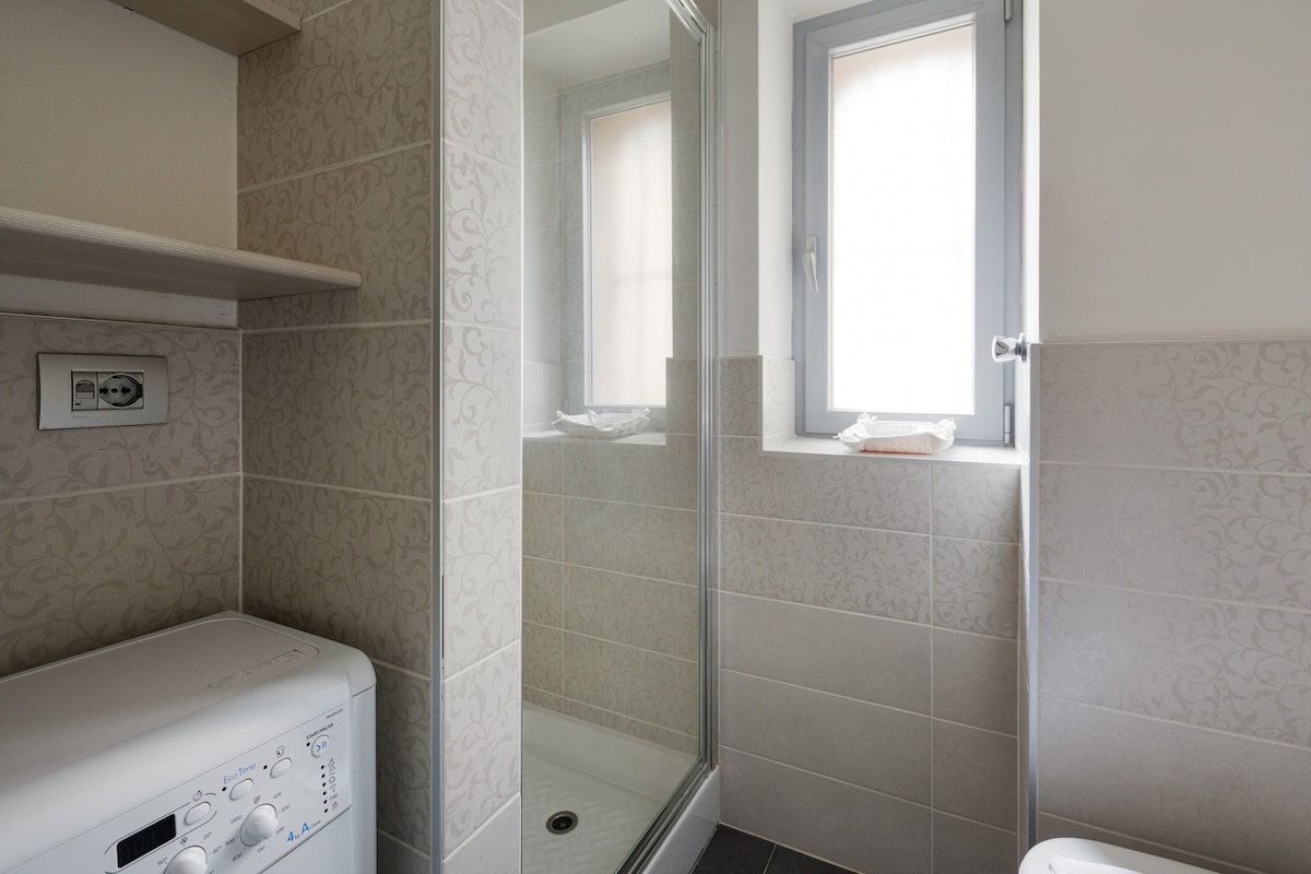 - BATHROOM with shower, sink, washing machine, bidet, and toilet;