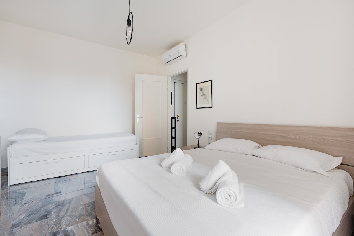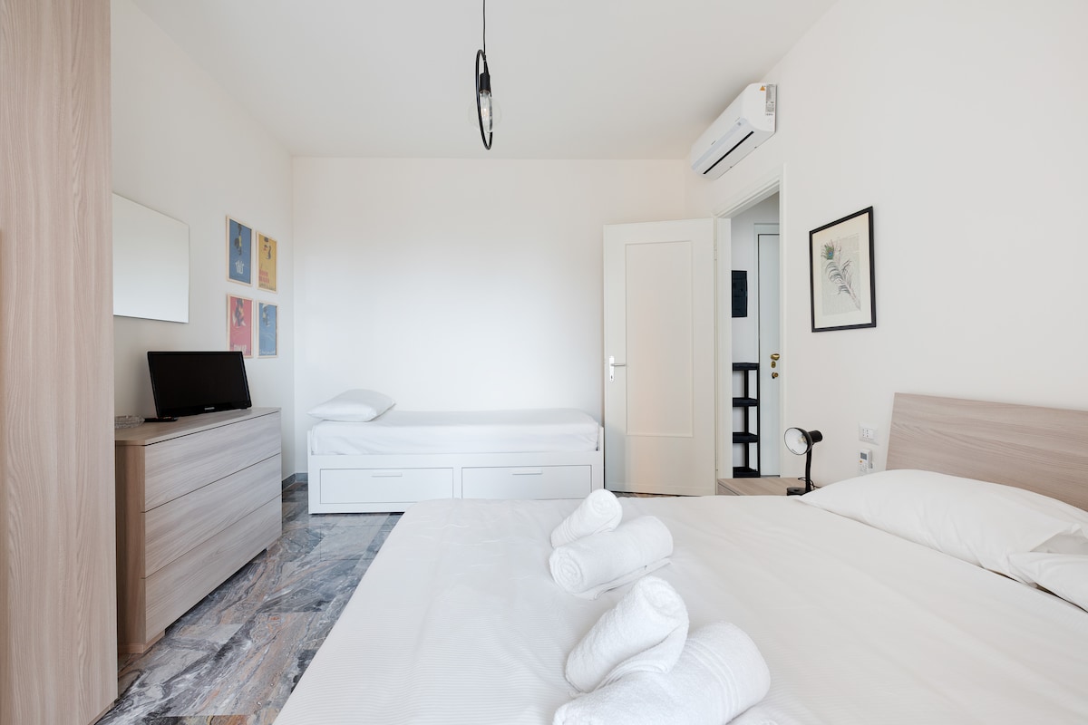 The interior space is organized as follows:- BEDROOM with double bed, single bed, hidden single bed, wardrobe, chest of drawers, TV, split A/C and access to the balcony;