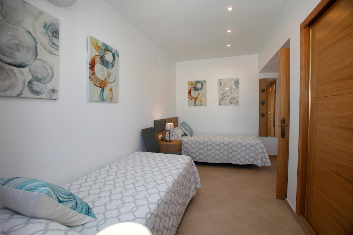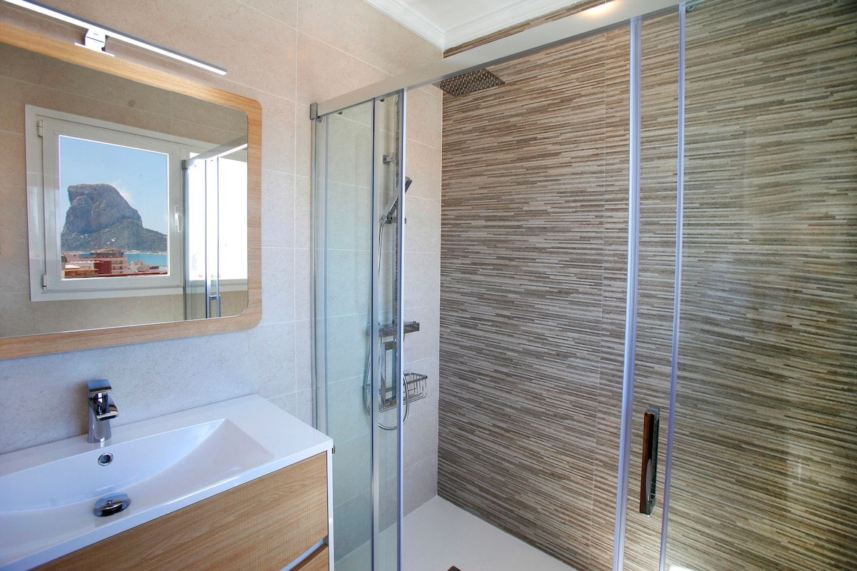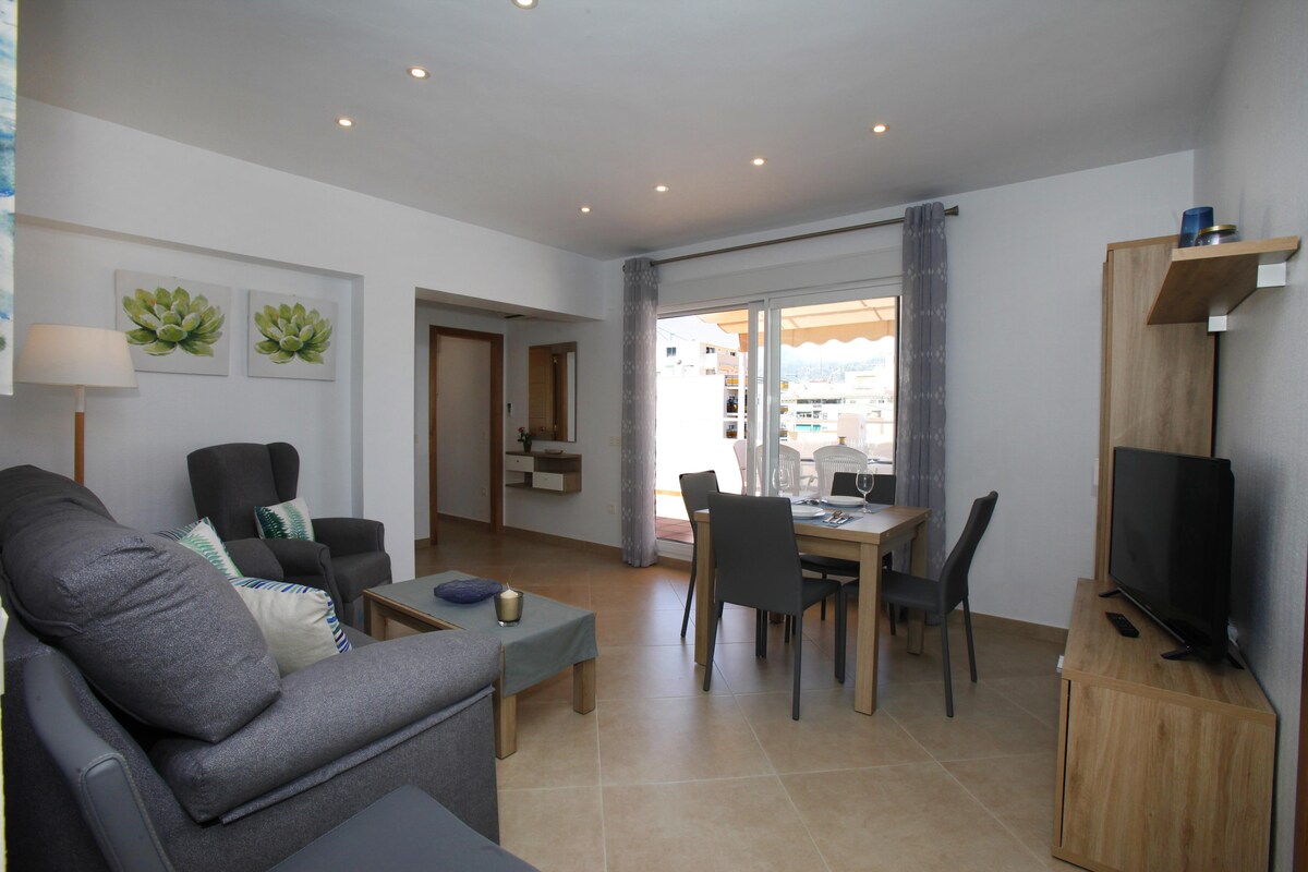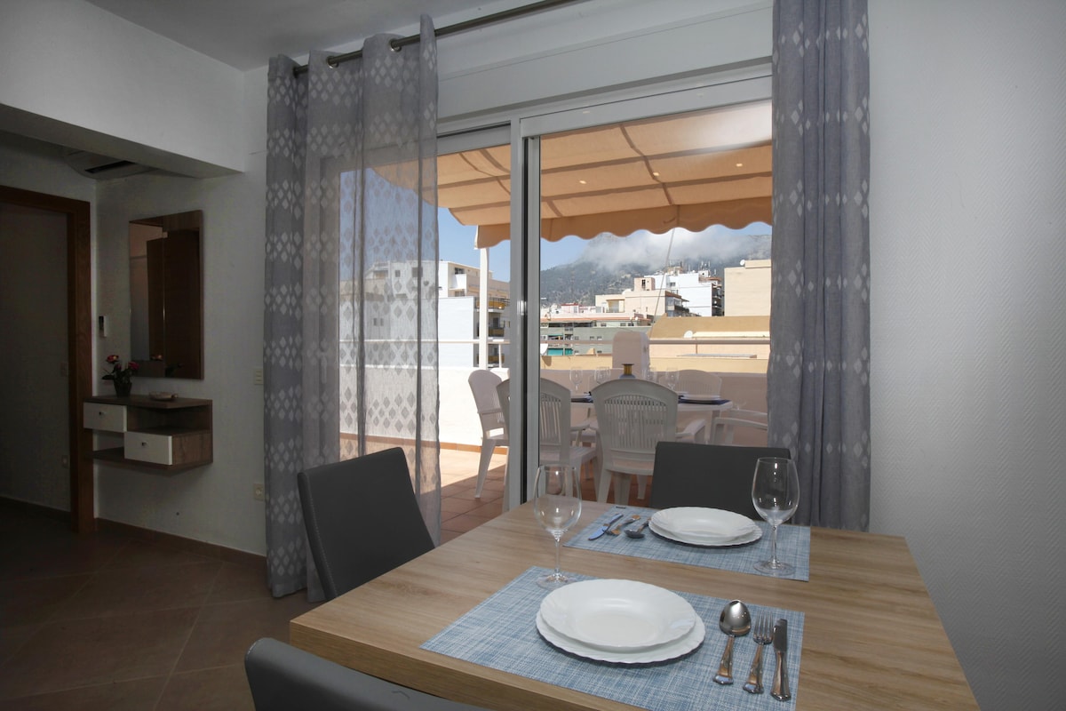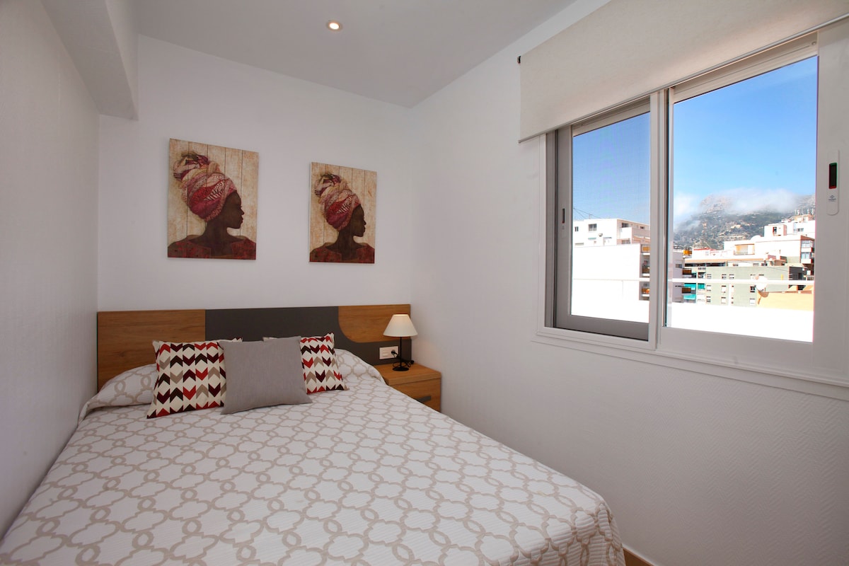 Whether you’re arriving in summer or winter, this fully refurbished (May 2018) 2-bedroom penthouse lets you enjoy a Spanish getaway beside the sea with local conveniences just minutes away.The property gets the best of the sun all day long - best enjoyed on your private 45 m2 rooftop terrace making it a fabulous spot for sipping drinks and grilling up evening meals in your barbecue.Indoors, the penthouse features two bedrooms: a stylish master bedroom with a double bed and a kid-friendly bedroom with two single beds; one full bathroom an open living/dining space, separate kitchen, air conditioning, Wi-Fi, satellite TV.With a location in Calpe town, you'll find local shops, bars and restaurants sitting on your doorstep. The beach is also just a 2-minute walk away and you're just an 5-minute stroll to the old town.This property is also perfect for short and long term stays throughout the year with many of the local shops and restaurants open year-round.After a day at the beach, there’s plenty of space to unwind in an open living, dining and kitchen area. Furnished with cool tiled floors, this social space has a sitting area with a TV and cable, a 4-seater dining table.The Outdoor Space: Your large, sun-drenched terrace is the perfect place to top up your tan on warm Spanish afternoons. In the evenings, enjoy drinks at a conversation area before ambling to a local restaurant for dinner. If you feel like cooking at home, gather around a dining table.The Surrounding Area: With a prime location in Calpe town centre, you'll find local shops, restaurants and bars sitting right outside your front door. And if you feel like a day stretched out beside the sea, it's just a two-minute stroll to the beach.Nº Licencia Turístico: VT-465917-A---------------------------------------------------------------------------------------Above all, at Costa CarpeDiem we want you to feel right at home from the moment you arrive. If you have any specific requests, just let us know and we will make sure it gets taken care of.Need a transfer from the airport? Best price on a car rental company? A recommendation on great local restaurants? Just ask, we will be happy to give you our best tips!Costa Blanca and Costa CarpeDiem are waiting for you!Interior of this holiday homeair conditioned living/dining room with television