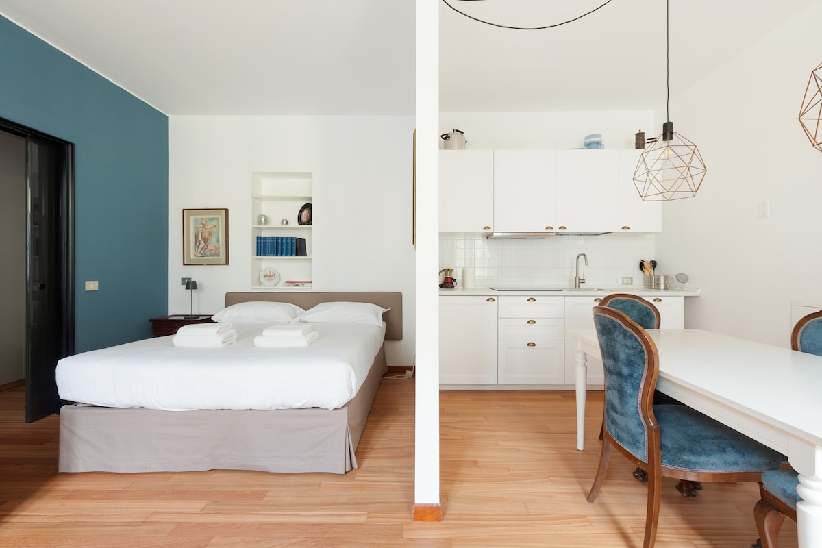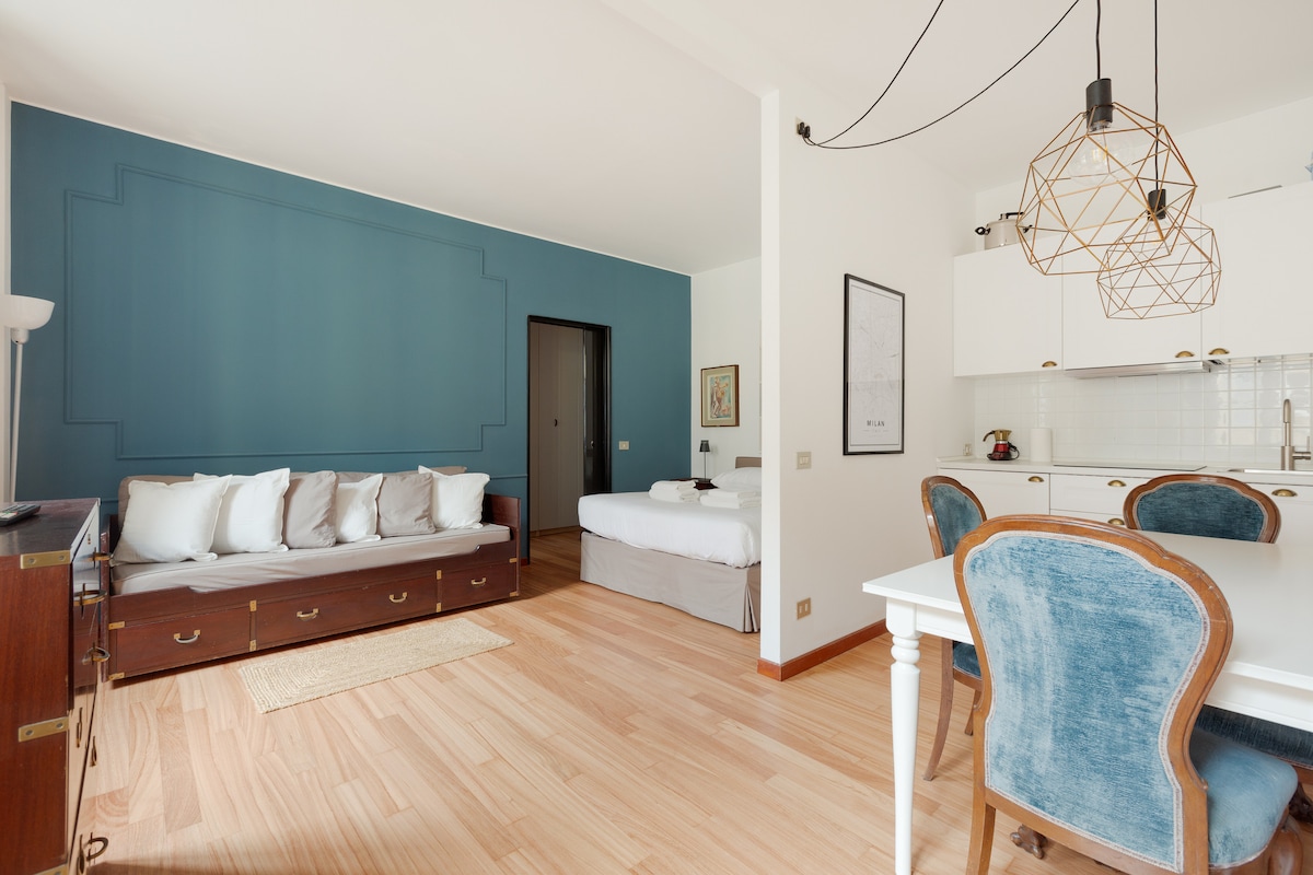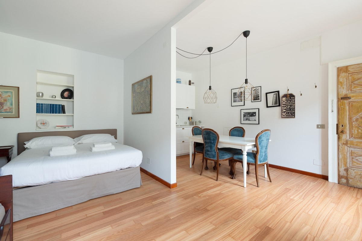 Elegant, bright and spacious 50m2 open space studio apartment, located on the second floor with lift of a typical Milanese building.