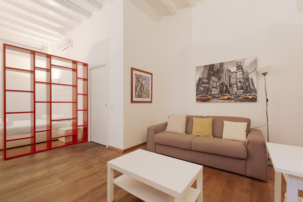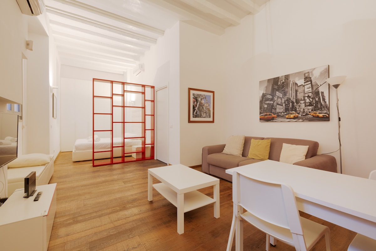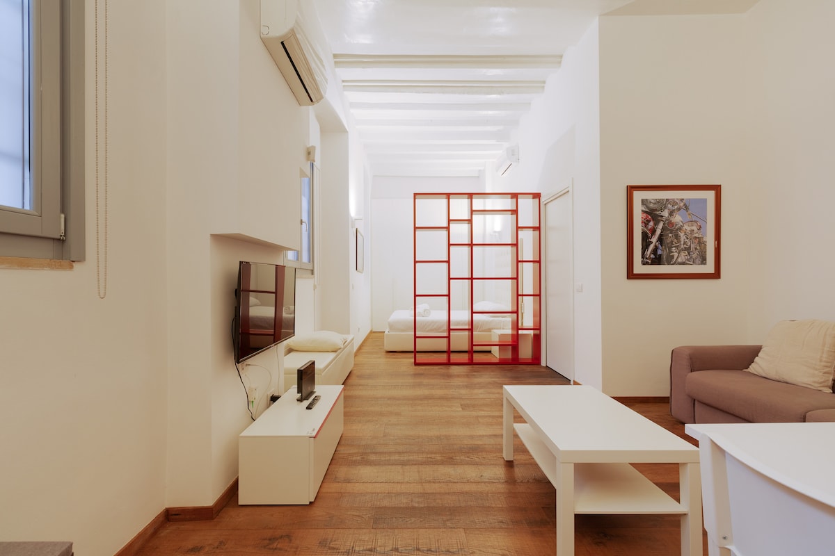 The space is organized as follows:- LIVING AREA with single sofa bed, dining table, TV and split A/C;