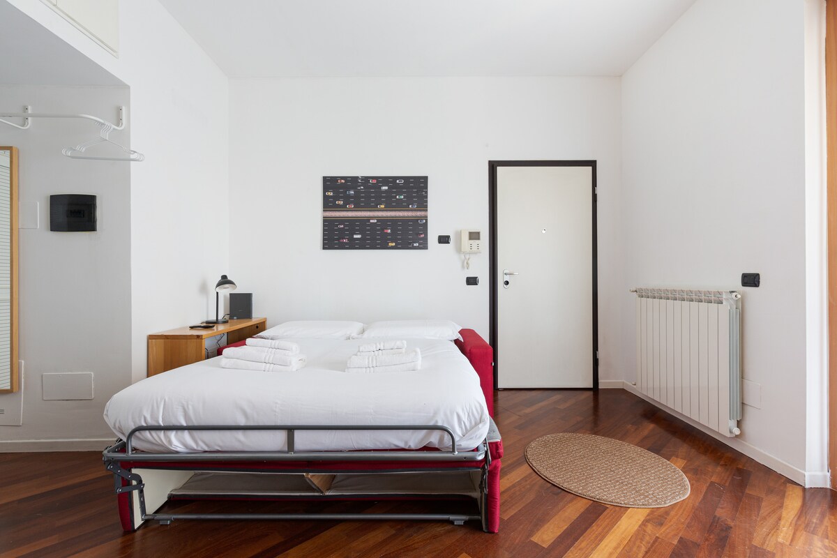 The interior space is organized as follows:- SLEEPING AREA with double sofa bed, desk, clothes stand, TV, balcony;