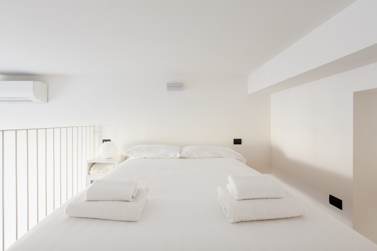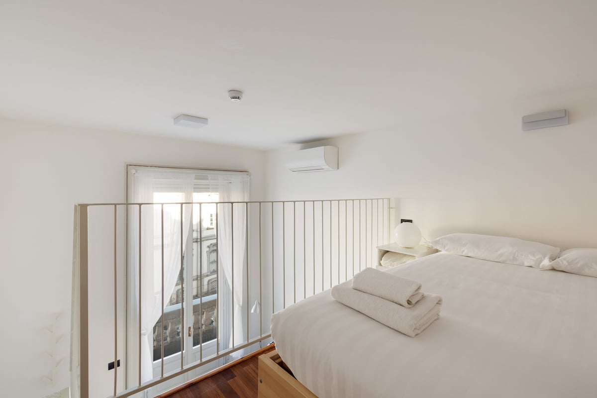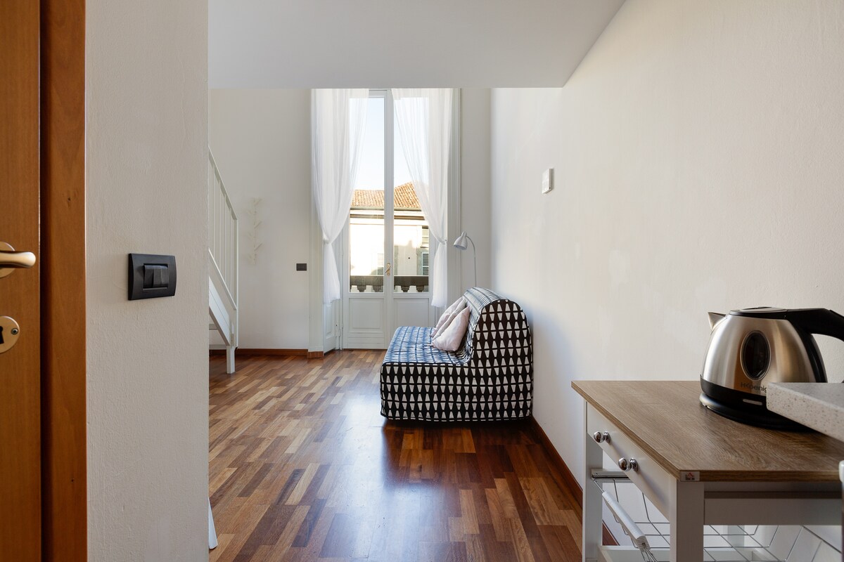 - LOWER LEVEL with relaxation area with sofa bed and small kitchenette with 2-burner hob, kettle, small fridge. Private balcony facing Corso Magenta.