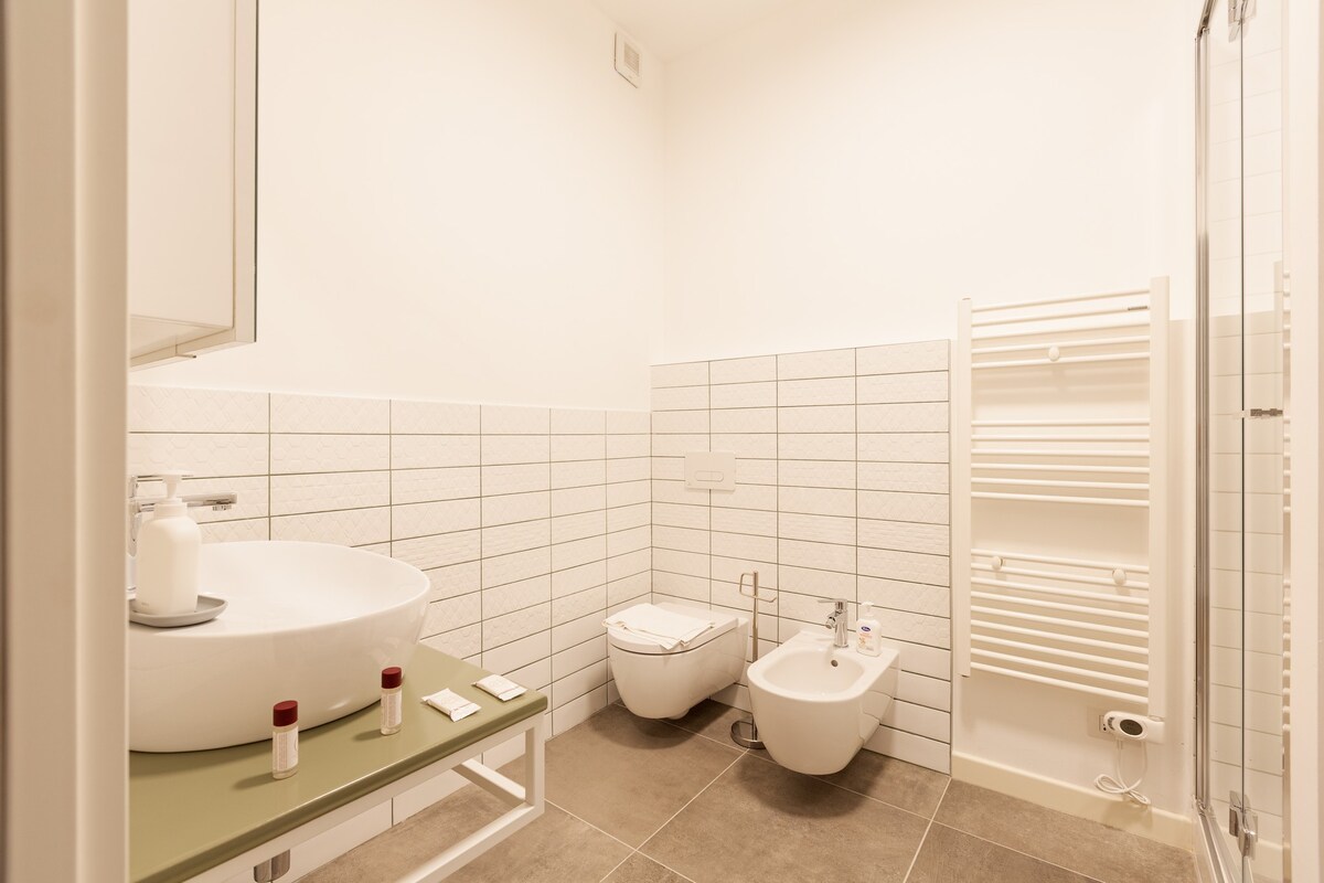 - BATHROOM with shower box (raised), sink, bidet, WC and washing machine.