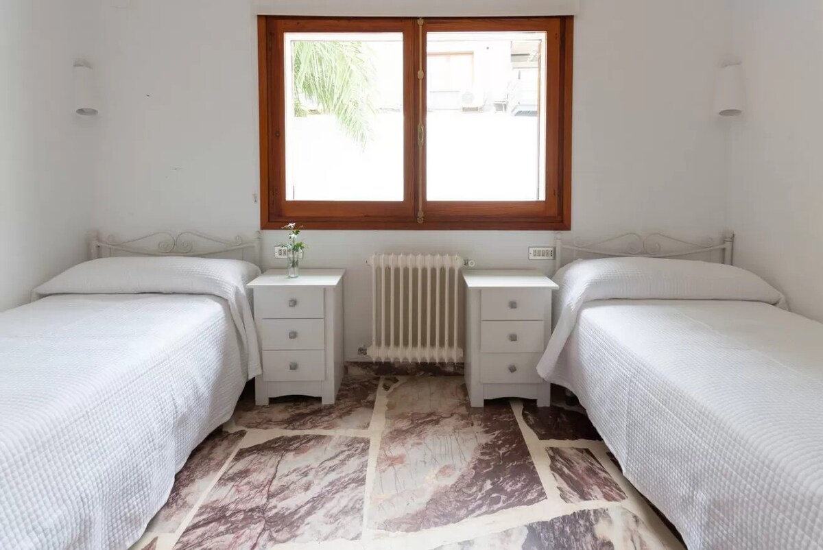 air-conditioned bedroom with 2 single beds
