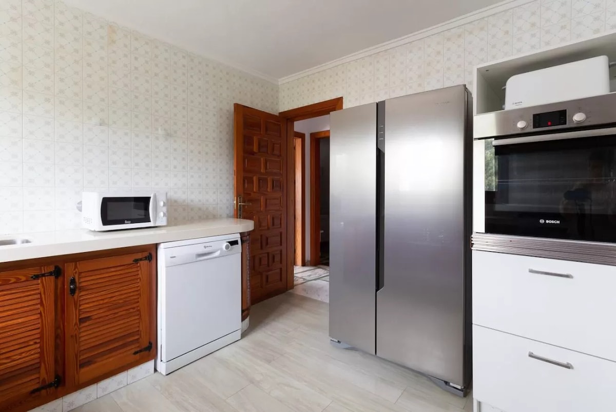 kitchen with gas hob, electric oven, microwave, dishwasher, refrigerator, freezer, coffee machine, electric kettle, toaster and juicer
