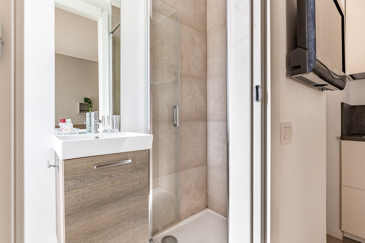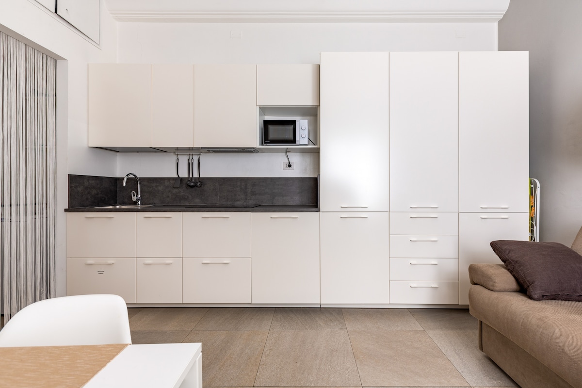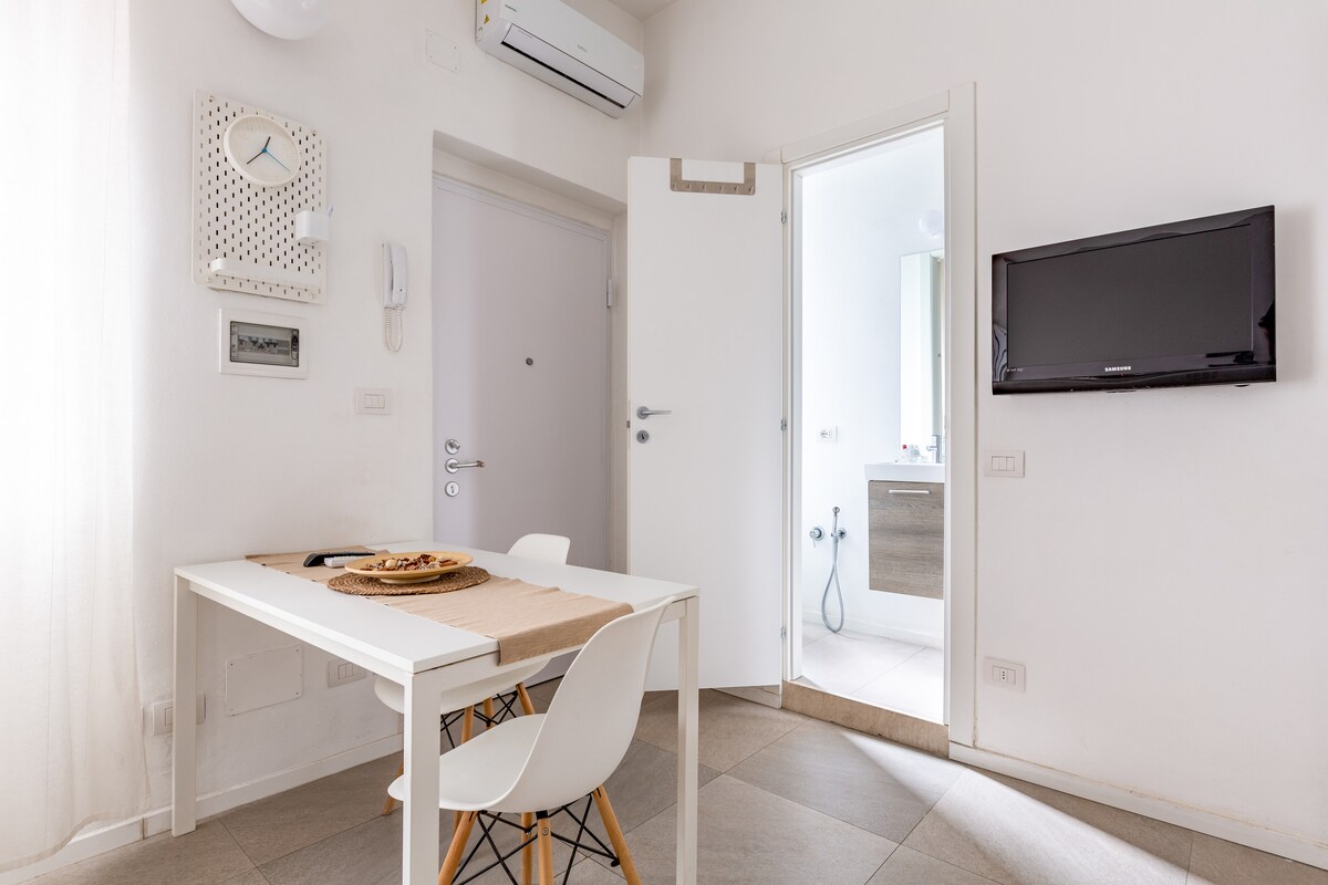 The accommodation is located on the first floor of a building without a lift. It is accessed via an external balcony shared with other tenants: the view is on the internal courtyard, therefore very quiet.The apartment consists of a single room divided into a sleeping area with double sofa-bed and kitchenette equipped with induction hob, microwave, refrigerator. Bathroom with shower box.