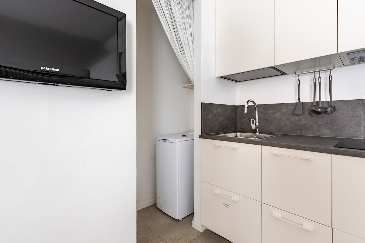 The apartment consists of a single room divided into a sleeping area with double sofa-bed and kitchenette equipped with induction hob, microwave, refrigerator. Bathroom with shower box.