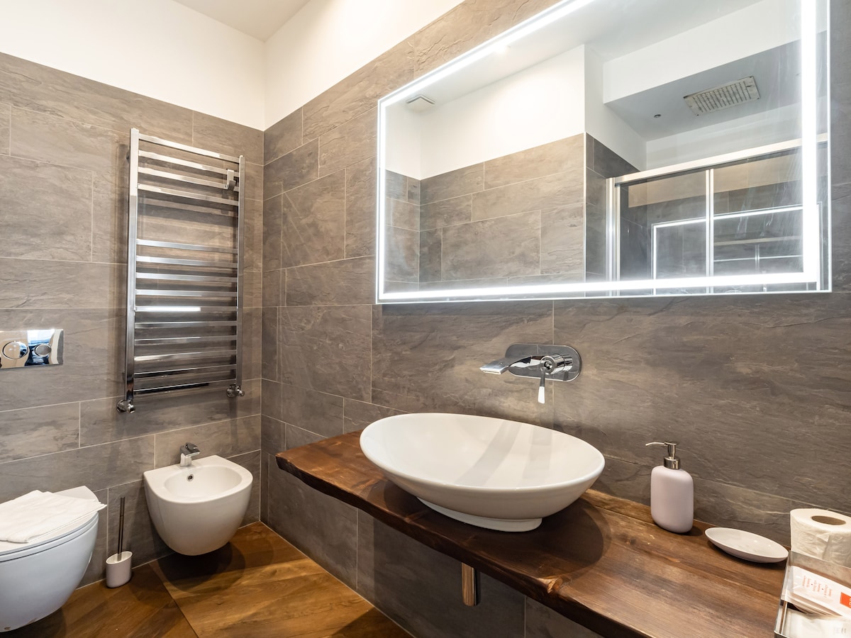 BATHROOM 1. Shower cubicle, bidet, toilet, sink and hairdryer.