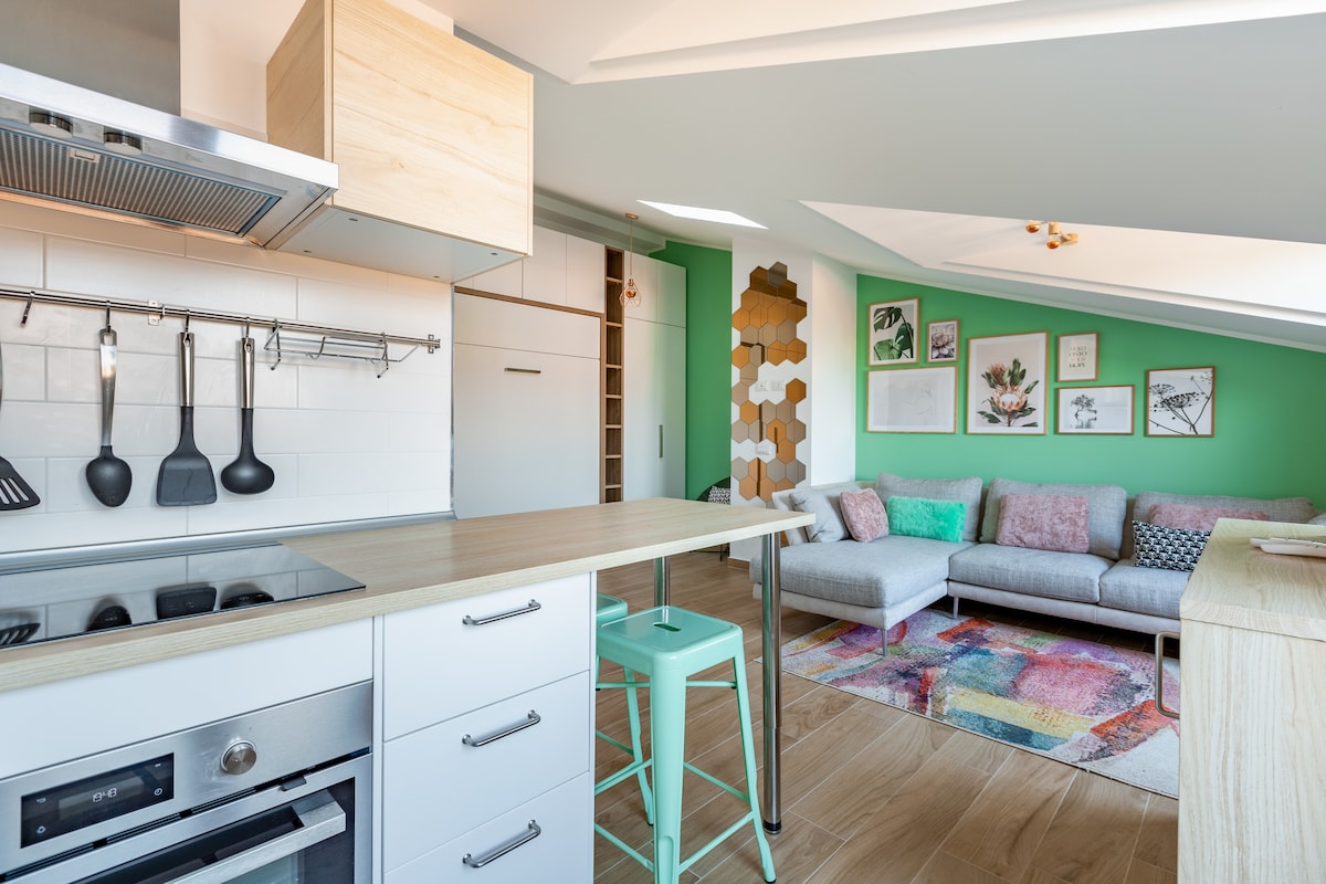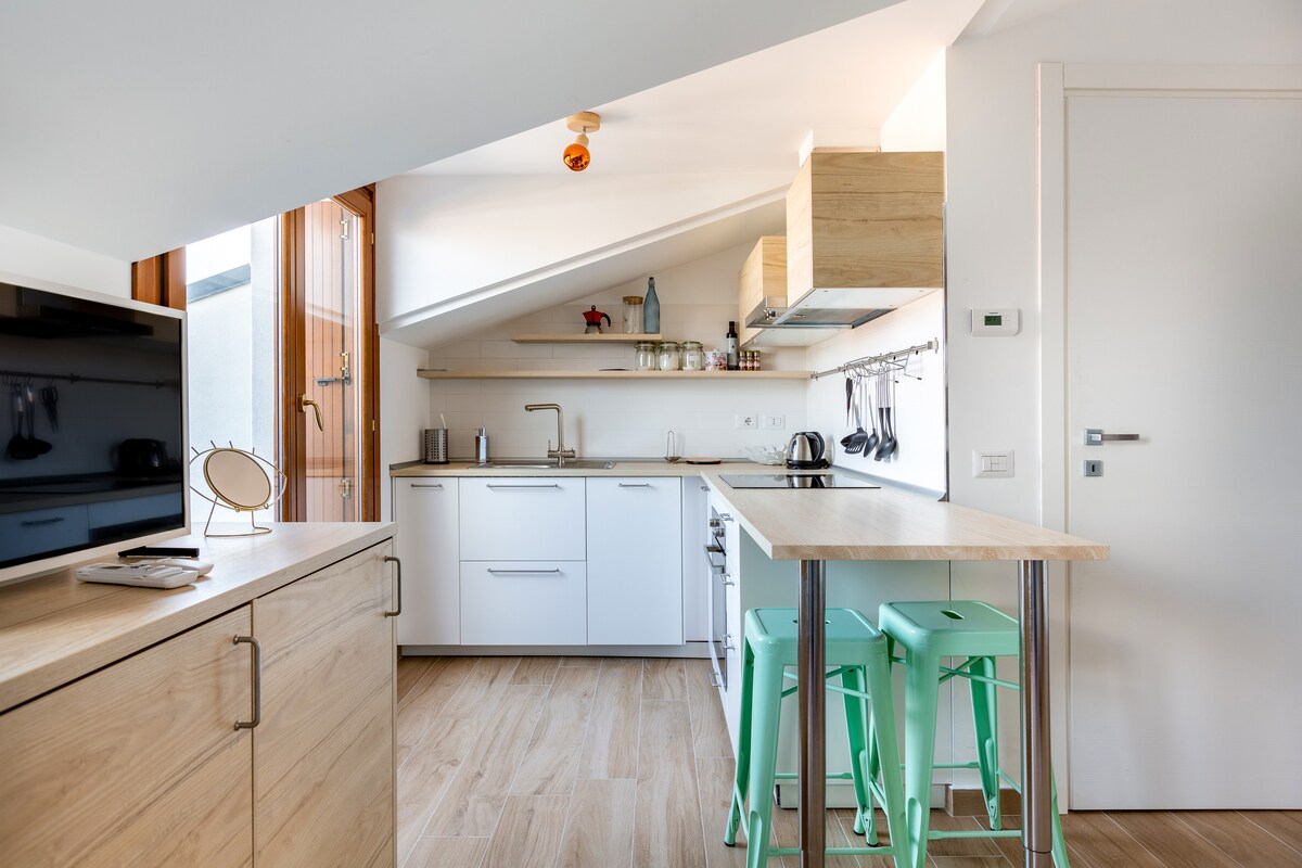 - KITCHEN CORNER with induction hob, moka, oven, kettle, fridge under the top with freezer;