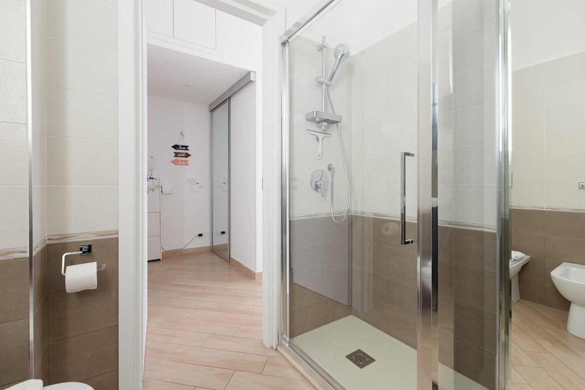 - BATHROOM with shower, sink, bidet, toilet and washing machine.