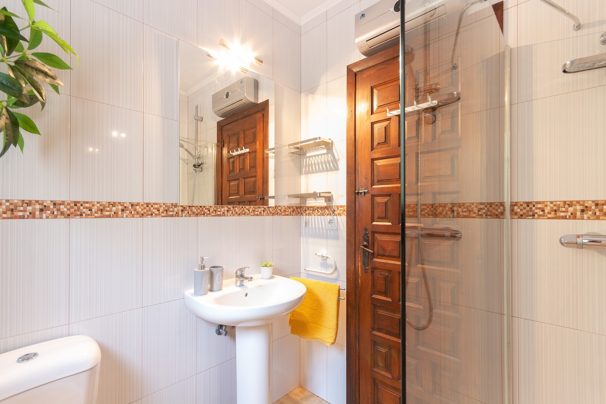 - bathroom with single washbasin, shower, toilet and hairdryer