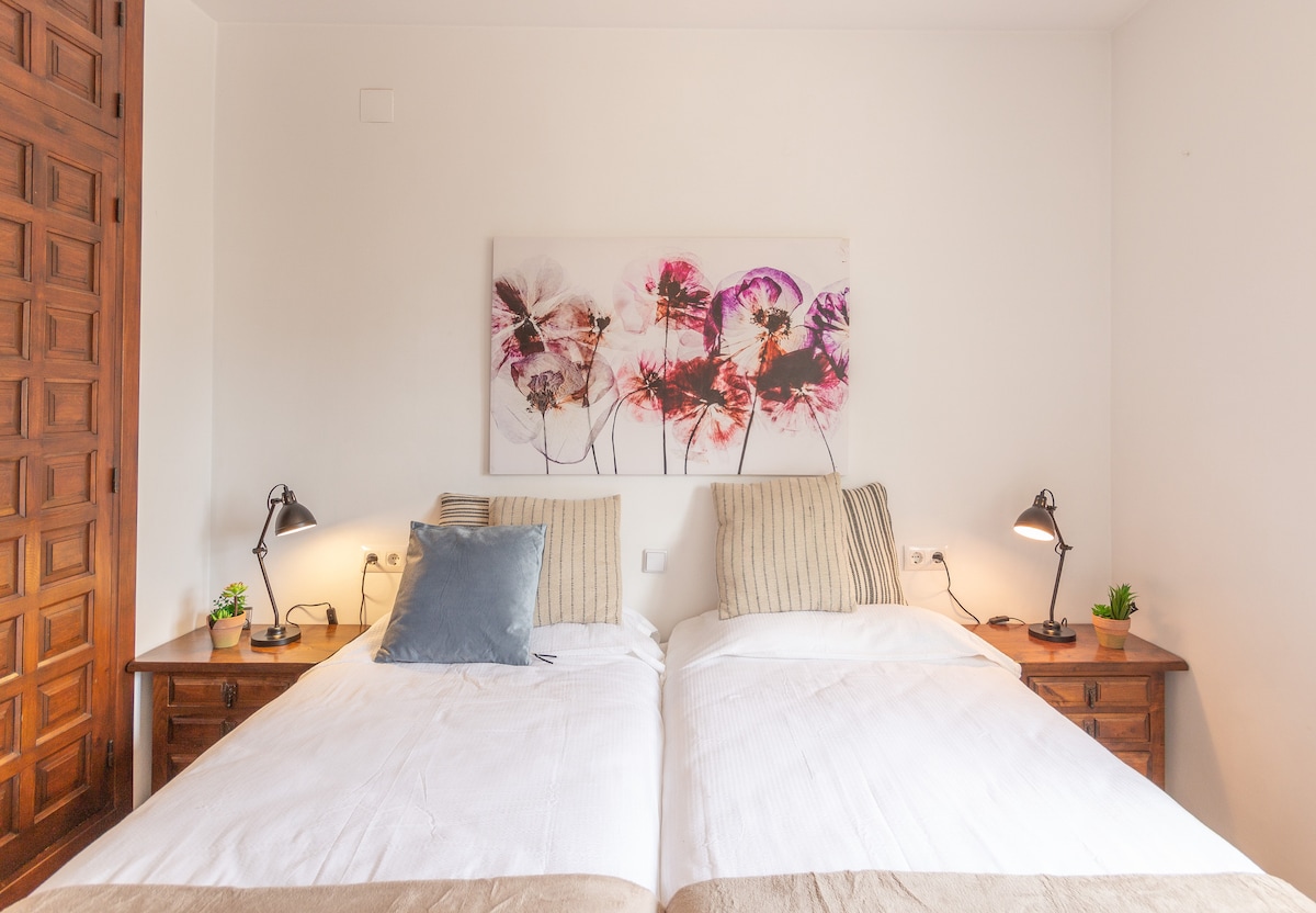 - bedroom with 2 single beds and fan