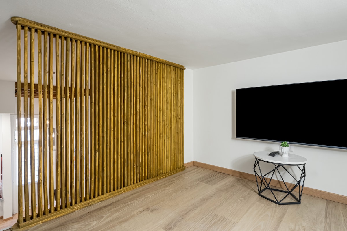 -Bedroom on the mezzanine reachable via internal stairs with double bed, split AC and TV. Please note: this room is not acoustically isolated from the rest of the house