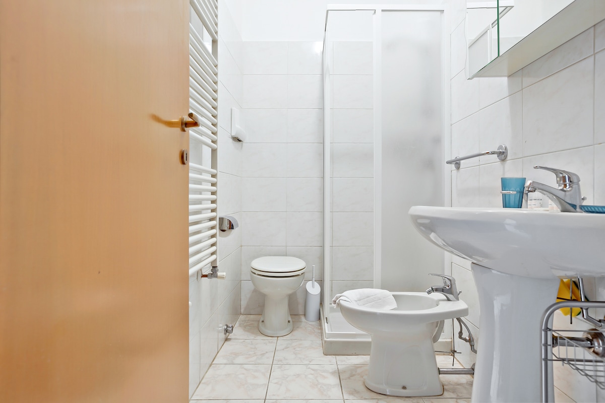 - BATHROOM with sink, shower, bidet and WC.