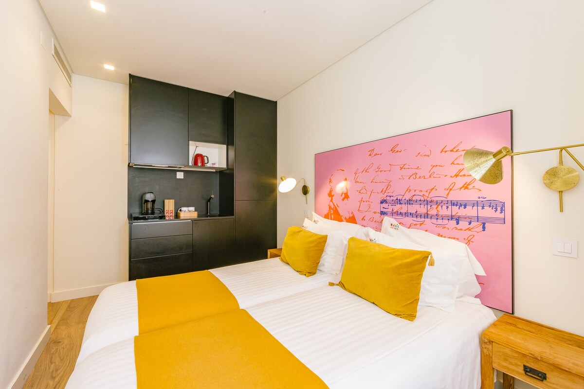 Located next to the famous Conservatorio Nacional, a music school founded in 1837 inspired the design of the rooms to translate the music and Lisbon mood through its textures, colours, and materials.