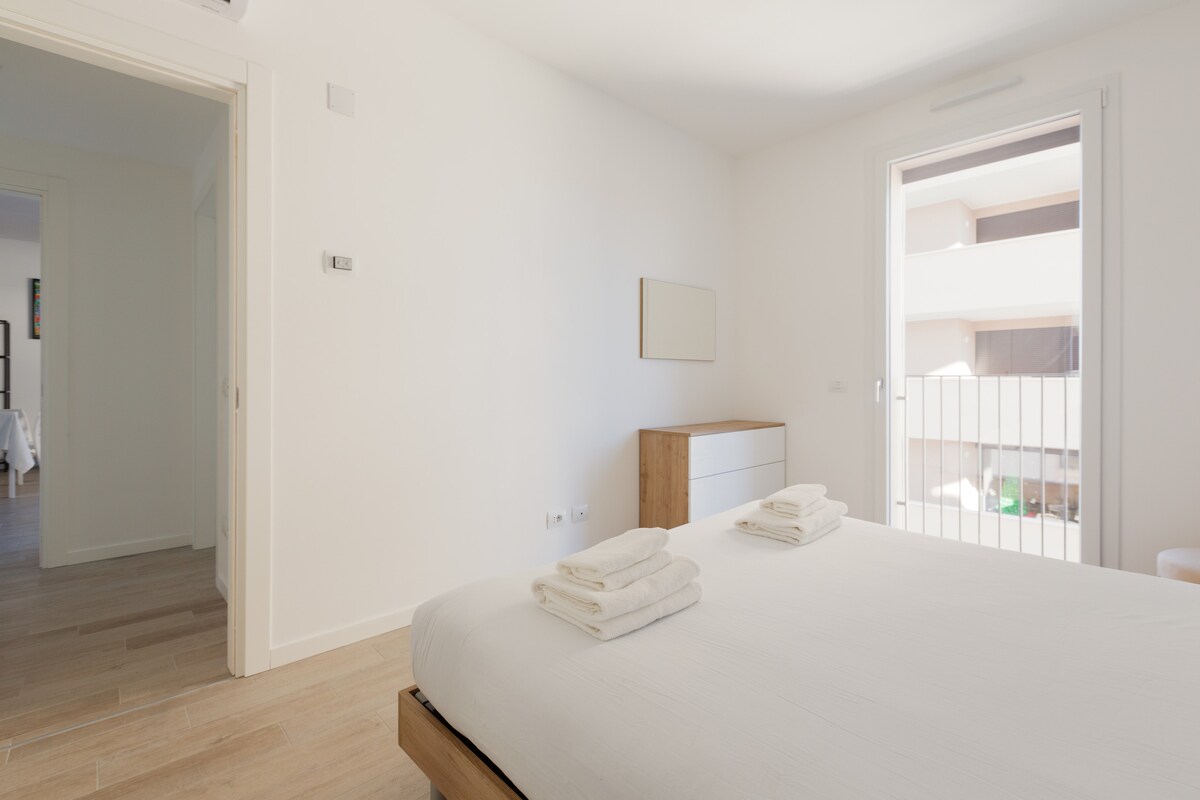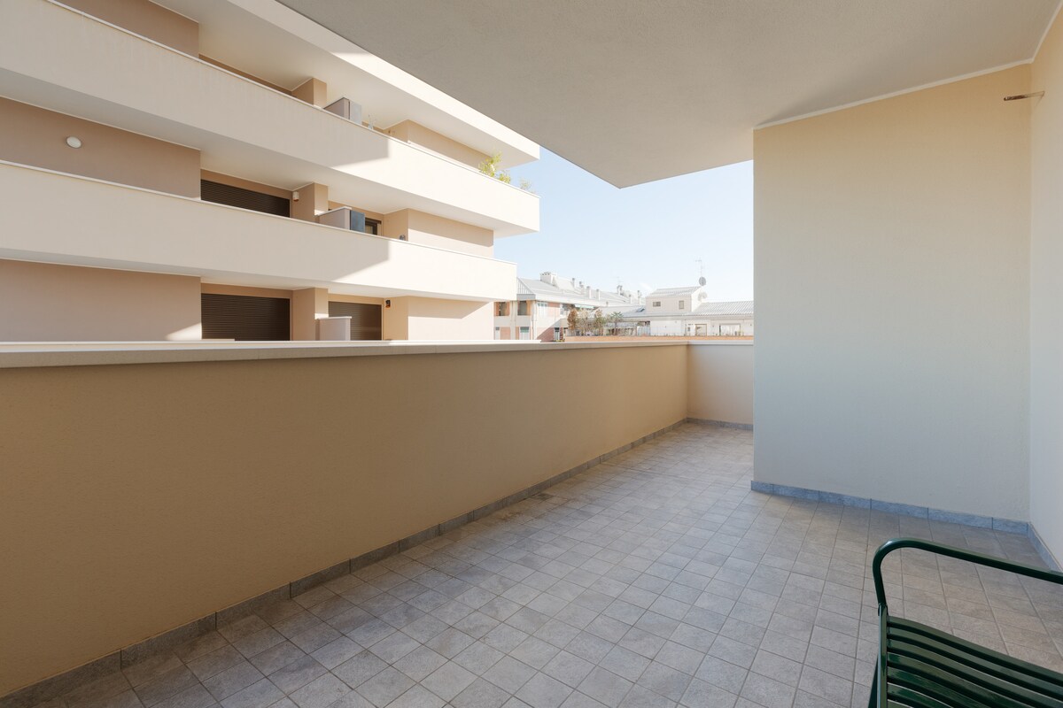The apartment consists of a bedroom, a living room with kitchenette, a bathroom and a large balcony.