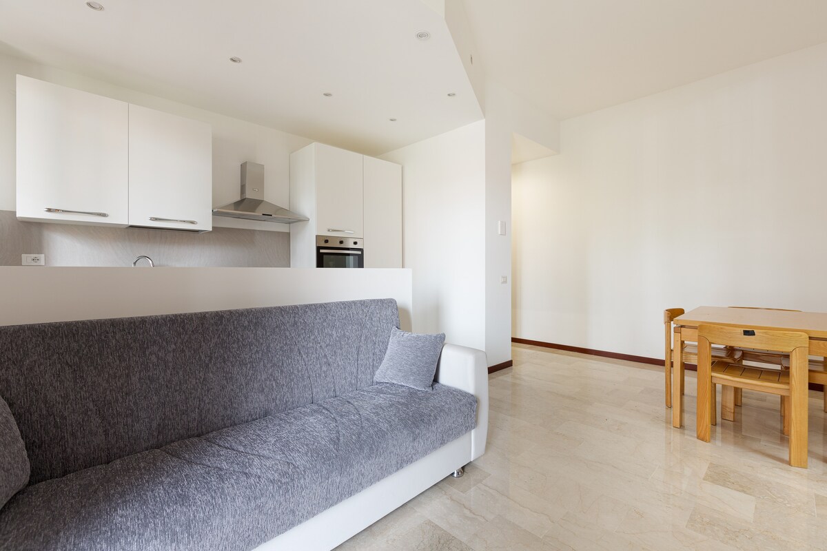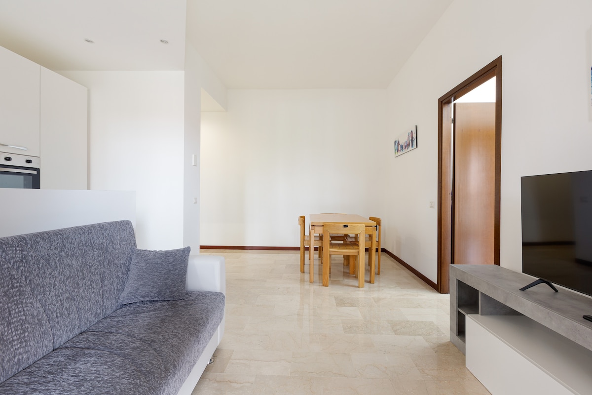 -LIVING AREA divided between a relaxation area with a double sofa bed and a 32'' Smart TV and an open kitchen equipped with an induction hob, a traditional oven, a dishwasher. Access to the terrace