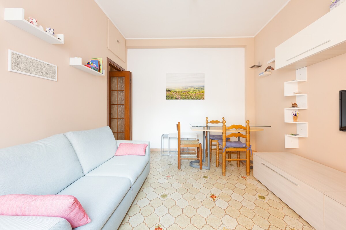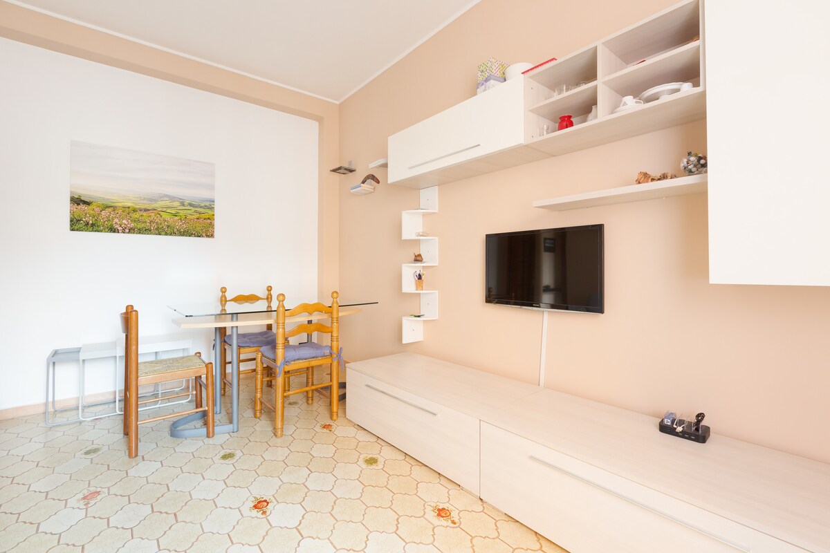 The 55m2 apartment is internally organized as follows:-LIVING ROOM with sofa, TV, dining table and split AC