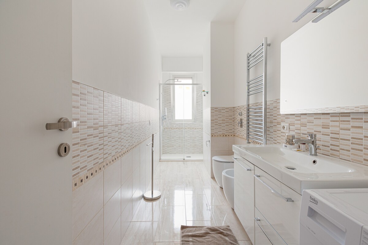 BATH. Shower cubicle, bidet, toilet, sink and hairdryer. Washing machine.