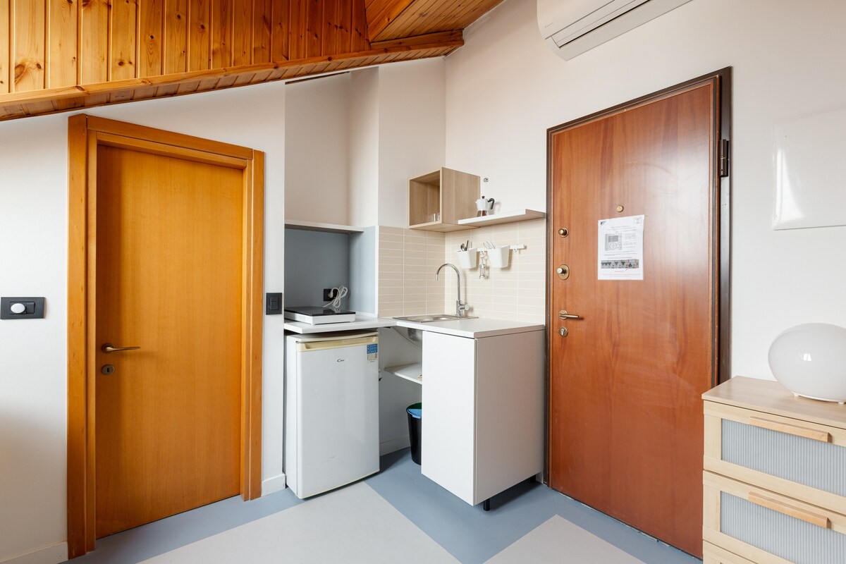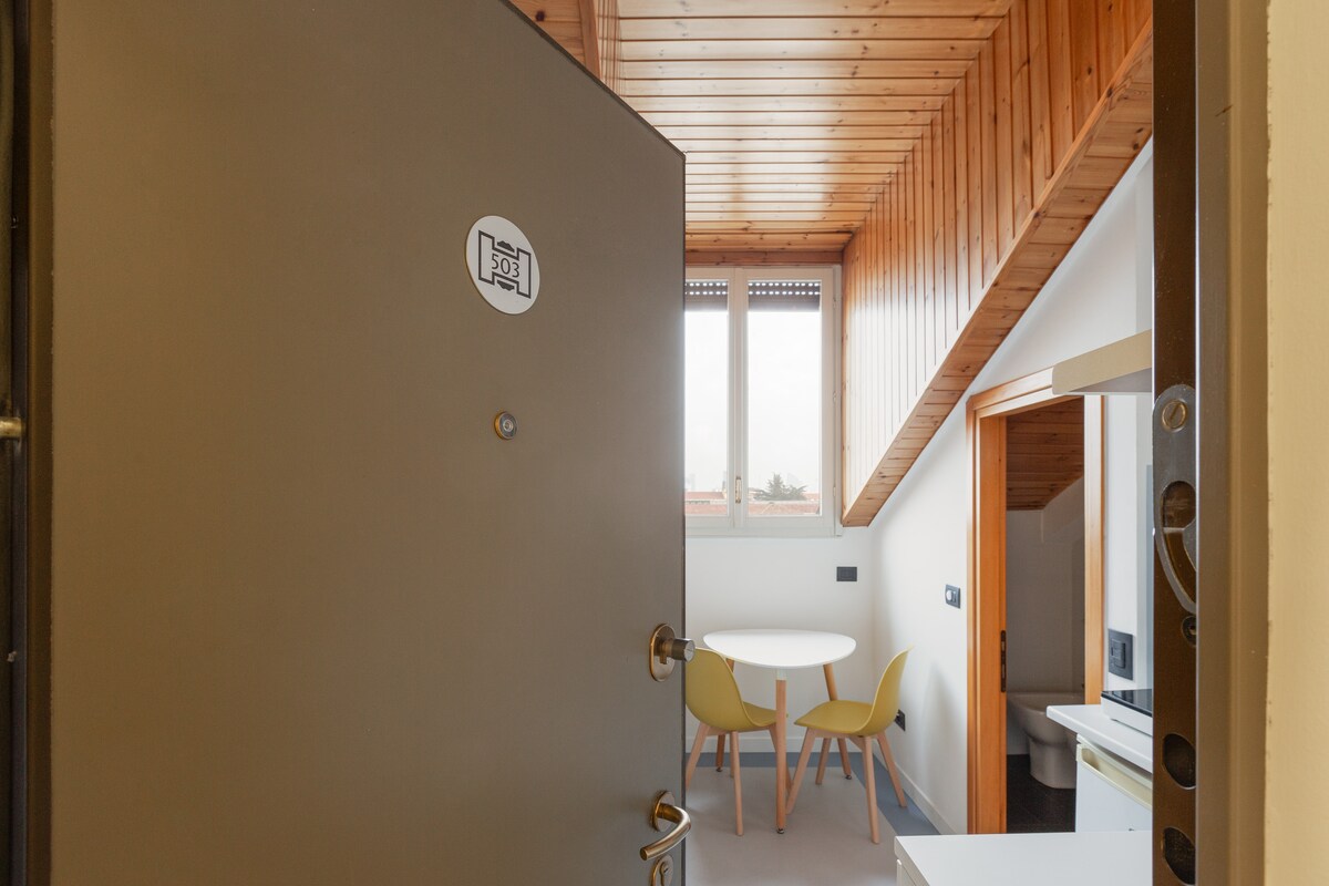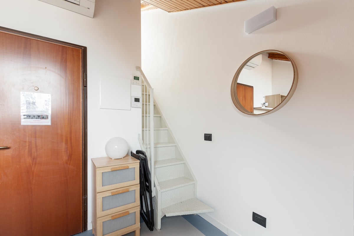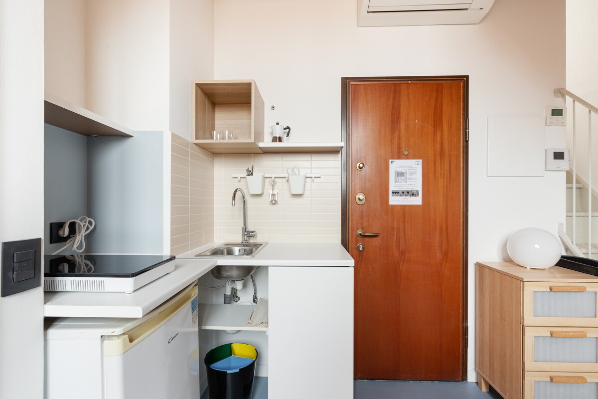 Apartment number 503 of approximately 25m2 is located on the fifth floor of an elegant Milanese building with concierge and a lift that reaches the fourth floor. The top floor must therefore necessarily be climb on foot. It has all the main comforts and is organized as follows:- LOWER LEVEL with relaxation area with sofa bed and small kitchenette with 2-burner hob, kettle, small fridge.