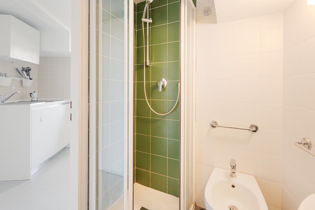 Bathroom with bidet and small shower box. There's a very small balcony.
